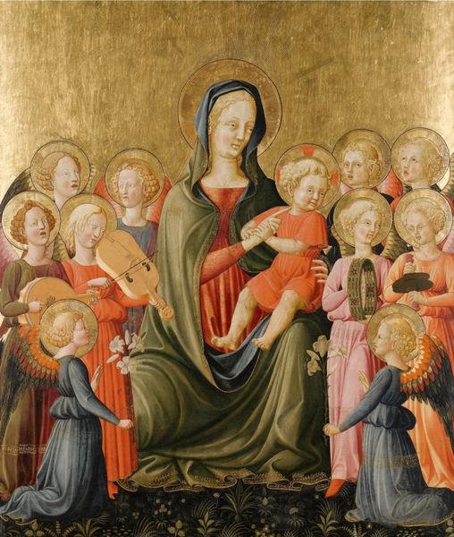 Curator: Looking at this work, my first thought is peace—a profound serenity washes over the scene. Editor: And that’s precisely what Benozzo Gozzoli aimed to evoke around 1450 when he created this tempera painting entitled "Madonna and Child between St. Francis and St. Bernardine of Siena". Curator: It's like a family portrait, but of a heavenly sort. St. Francis and St. Bernardine flanking Mary and the Christ Child, halos gleaming, each a figure steeped in symbolic meaning. The layering of sacred figures offers protection and conveys communal reverence, almost as if inviting the viewer into this blessed circle. Editor: Gozzoli, very much working within the Early Renaissance ethos, skillfully presents these figures. Notice how the hands of St. Francis and St. Bernardine are clasped in prayer? A direct appeal to the viewer's devotion. Mary's gaze is cast downwards, a classic representation of humility and maternal care. The positioning suggests divine authority, too, subtly enhanced with those heavenly attendants—angels—looking over. Curator: And there is also this interesting visual paradox happening. Despite its rather conventional subject, Gozzoli has instilled a kind of quiet domesticity. The gold halos might imply the sacred, but the warm flesh tones and realistic details bring a tangible, human element into play, a certain relatability and closeness. Editor: I think what's quite beautiful is how this painting weaves the earthly with the divine, and indeed how religious devotion is intertwined with a distinctly humanist perspective which marks the Renaissance understanding of our place in the cosmos. Each element serves to reinforce a network of religious symbols—the painting invites meditation on faith, but at the same time affirms earthly beauty and everyday sentiments. Curator: I agree; it all converges on a deeply personal connection—a silent dialogue that transcends centuries. Editor: It's certainly an image I could spend hours absorbing. What a potent fusion of spirit and artistic finesse.