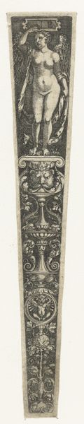 Sebald Beham created this "Vlakdecoratie met onderaan een gehurkte sater" in the 16th century. The artwork is composed of symmetrical patterns and classical motifs, constructed with fine lines on a small vertical scale. This dense ornamentation evokes a sense of crafted precision. Beham employs symmetry to structure the composition; the arrangement of vases and foliage creates a balanced visual rhythm. The recurring motifs and their calculated placement suggest an intellectual interest in order and harmony, reflecting the era’s humanist values. The satyr at the bottom introduces a contrasting element. It disrupts the rigid verticality and abstract perfection of the classical motifs, and its inclusion hints at the tension between the rational and the irrational in Renaissance thought. In summary, the interplay between the ornamental structure and the figure is a negotiation between ideal form and the destabilizing force of nature. This contrast invites ongoing interpretation into the cultural values of the time.
