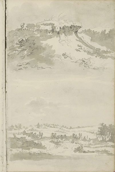Curator: Ah, here we have "Boerderijen," a pen, pencil, and ink drawing with watercolor on paper, created around 1780 to 1800 by Barend Hendrik Thier. Editor: My immediate feeling? Utter tranquility. The soft, muted tones evoke a sense of quiet solitude, a secret little world rendered in delicate lines. I can almost smell the damp earth and hear the rustling of leaves. It feels deeply personal, a fleeting moment captured in time. Curator: Absolutely. Thier, working at the end of the 18th century, presents a charming slice of rural life. You get two for one with the sketchbook composition, with landscape details and genre painting elements on the same page, and it offers insight into the realities and ideals of agrarian existence. Editor: The way he uses the light and shadow, particularly on the thatched roofs, gives the farmhouse a gentle, almost dreamy quality. The composition with a small human figure atop of one of the house creates a juxtaposition, amplifying both scale and inviting the observer to fill that figure with narratives. I imagine children playing here or someone quietly tending the hearth. Curator: It reflects the growing interest of the Dutch middle class in the countryside. Paintings became increasingly devoted to what one would consider now leisure landscapes depicting ideal pastoral visions as rural-urban connections intensified. The art market answered by creating demand for genre scenes that were not overly critical of class division. Editor: I also find it interesting how seemingly simple lines carry such an emotional weight. It's not trying to be grand or impressive; it simply offers a quiet moment of contemplation of human’s inhabitation and domestication of natural environments. It suggests to me, this image, how contentment and closeness might exist in the same time-space. Curator: Indeed. The seemingly casual sketch reveals Thier's command of draftsmanship, transforming ordinary buildings into something both picturesque and historically significant. Art institutions at that time aimed at moral progress to instruct public through art. Artists played that game rather well, I would say, Editor: In a way, "Boerderijen" feels like a gentle invitation to slow down and find beauty in simplicity. Thanks for making me reflect about it beyond what it shows and see what it does, I love the perspective you provided today. Curator: The pleasure was all mine! This drawing prompts me to appreciate how representations of countryside helped form national identity, offering comfort and familiarity at a time of immense political and social change. It’s not just art, but history itself, whispered in ink and paper.