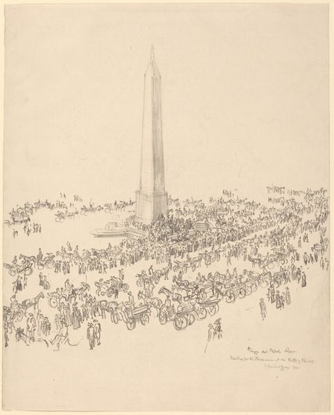 Editor: This is a photograph from 1936 by Wouter Cool titled, "Mijlpaal No. 0 van de U.S.A. Washington Monument", and it’s a gelatin-silver print. I'm struck by how stark and geometric it is. What do you see in this piece from a formal perspective? Curator: The overwhelming sense one derives is the monumentality achieved through stark simplicity. The composition is divided into distinct planes of light and shadow. The Washington Monument itself serves as the primary vertical thrust, a rigid obelisk juxtaposed against the softness of the surrounding foliage and expansive sky. Consider the tonal range achieved within the greyscale; note the subtle variations of light that define the monument's texture, contrasting with the flattened, almost abstract rendering of the sky. Editor: So the contrast is really important? Curator: Precisely. The geometric purity of the monument, a series of stacked shapes culminating in a sharp point, provides a stark counterpoint to the organic forms surrounding it. This contrast emphasizes its constructed nature, its artifice. Notice too how the photographer has positioned the monument slightly off-center, preventing a static symmetry. Does this deviation introduce a sense of dynamic tension? Editor: It does create a slight unease, almost as if the monument is about to shift. It’s less a celebration and more of a study of shapes and tones. Curator: Exactly! The essence resides in the relationships between form, light, and texture, stripping away superfluous narrative to reveal the underlying structural framework. In doing so, Cool draws our attention to the very essence of the photographic medium. Editor: I now see how the simplicity emphasizes those contrasts, it completely shifts how I appreciate the piece. Curator: A close reading reveals a complexity masked by apparent simplicity; the photograph operates on a purely formal level, a testament to Cool’s Modernist approach.