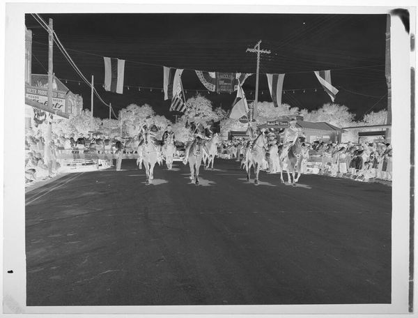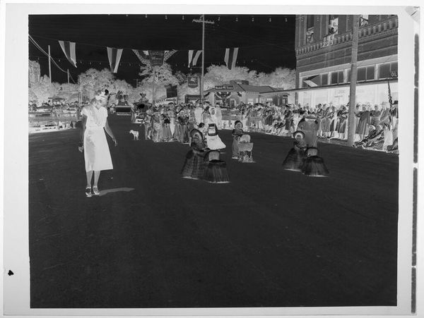 Editor: This photo by Hamblin Studio, "Untitled (used car sale)," shows a crowd gathered for what looks like a promotional event. It feels like a lost moment, a peek into a different era. What cultural symbols jump out at you? Curator: Notice how the cars themselves become symbols of aspiration and freedom, especially in a time of economic uncertainty. The banners, reminiscent of celebratory garlands, ironically frame the scene. Consider the eagle motif above the crowd, a complicated symbol. Editor: Complicated? How so? Curator: The eagle, often associated with national pride and prosperity, here hangs above a scene of commercial transaction, hinting at the blurring lines between national identity and consumerism. What does the "used car" suggest? Editor: Maybe the promise of upward mobility, accessible to more people. I hadn't considered the eagle that way. Thanks! Curator: The photograph reminds us that symbols constantly evolve, reflecting changing societal values. It’s a fascinating dance between image and interpretation.
