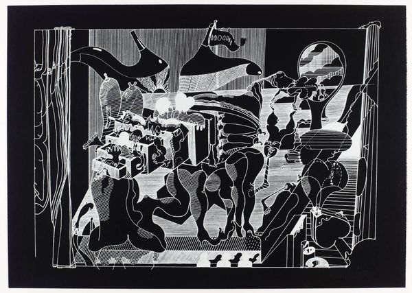 Robert Peak made this image "The Movies" with what looks like a collage of gouache and pencil. The composition is wild, a cascade of figures tumbling over each other! The texture here is smooth; Peak's blended his colors, especially in the central female figure, so that you can barely see the brushwork. But then there are the pencil lines that jump forward, defining the different elements. Look at the hand in the foreground, laden with rings. There's a tension there between the flat shapes and the illusion of depth, between the fine lines and the blurred edges. I like to think about Picasso and the way he played with the surface of the canvas. Peak reminds me a little bit of David Hockney; both were masterful draughtsman, and both had a flair for capturing the look and feel of their times. In art, there are no final answers, only ongoing dialogues!