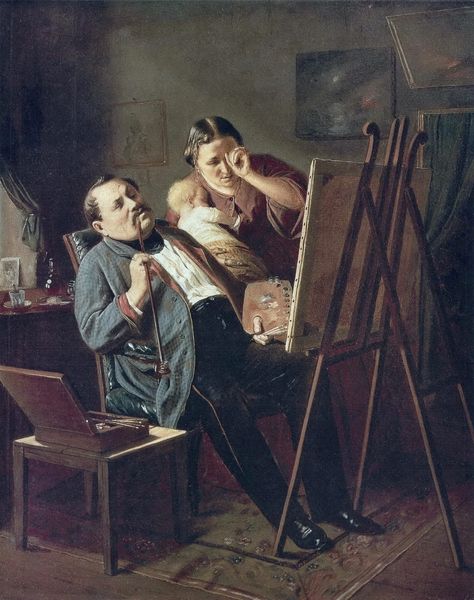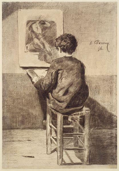 Théodore Géricault created this small oil on canvas painting, "Young Painter at his Easel," sometime in the early 19th century. The composition is dominated by muted earth tones, setting a somber mood, and its textural brushstrokes are loose, giving a sense of immediacy. The painting's structure invites us to consider the act of artistic creation itself. Notice how the young painter is framed by the geometric forms of the easel and the box he sits upon. These shapes create a visual scaffolding that emphasizes the constructed nature of art. Géricault seems to be engaging with the Romantic era's concerns about individual expression. By focusing on the tools and environment of painting, Géricault prompts us to think about how artistic identity is formed through practice and material engagement. The very act of painting becomes a subject, a theme, a space for questioning the nature of representation.