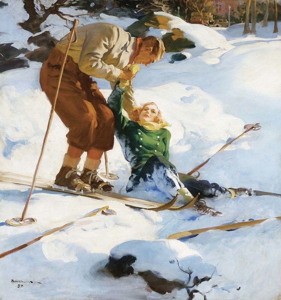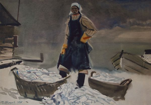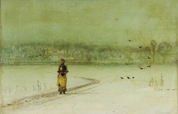 Curator: Immediately, there's something quite eerie and beautiful about this scene. The colors are muted, the landscape is bleak, and the figure is hauling this strange, colorful burden. Editor: What grabs me is this overwhelming feeling of isolation despite this landscape being part of an aesthetic. It’s quite striking. I can already imagine unpacking all sorts of themes. Curator: Let's contextualize. What we have here is "The Mainland," an acrylic on canvas work crafted in 1992 by Jamie Wyeth. It exemplifies, in many ways, narrative-art—but on first viewing, how do you relate to Wyeth's approach to landscape? Editor: Knowing that helps frame my understanding, particularly how Wyeth situates the figure in their setting. It strikes me as less of a classic landscape and more as a stage upon which a narrative of individual struggle, maybe environmental burden, is playing out. This figure is not simply in nature; they are interacting with it, bearing its weight, even being overwhelmed. Are we seeing Wyeth perhaps acknowledging climate change or its social injustice aspects decades before it gripped the mainstream imagination? Curator: Well, given Wyeth's inclinations, I would push against ascribing specific contemporary social critiques to it. The image taps into wider American historical discourses. This is not unlike works during the Depression or those addressing similar ideas about societal outcasts or pioneers burdened by material needs or seeking new frontiers in a transformed natural environment. However, I certainly can entertain those concepts because the ambiguity, in its setting or with its specific burden, is the powerful key. Editor: Fair point. This person could very well be burdened by their physical surrounding and circumstance rather than forging out of their will, something very relevant for our era. In either case, the figure's anonymity, that averted gaze and simple garb, I find incredibly poignant when considered alongside whatever commentary Wyeth might offer through such an evocative image. Curator: And speaking to its presentation, the details are really impressive and the medium does justice to it. From the slushy snow to the muted and moody skyline, the naturalistic precision grounds the painting. However, there is a surreal contrast because he uses bold acrylic paints and not just dull colors. Editor: Absolutely, that tension between the real and unreal, between hope or destruction, makes the work deeply compelling. Thank you for sharing that viewpoint, and this feels like a conversation that could extend further as more art patrons and experts discuss Wyeth's art! Curator: Exactly, it seems the deeper we look at it the more it brings into perspective about an artist and American Art, and our changing perspectives on the landscape's significance.