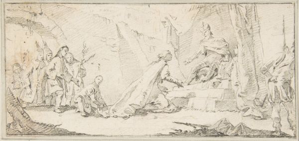 Editor: Here we have "Illustration for a Book: Allegory of Venice," a print and drawing created sometime between 1696 and 1770 by Giovanni Battista Tiepolo. It's at the Met in New York. It feels… unfinished, like a glimpse behind the curtain. What jumps out at you when you see it? Curator: Well, the initial sketchiness is exactly what grabs me. It's like catching Tiepolo in mid-thought. You see the lion, symbol of Venice, prominently featured, but rendered with such delicate lines. I wonder, does it project strength or vulnerability here? It is as if he's contemplating Venice's place, its identity – a reflection not just of power but perhaps the anxieties of a city in a changing world. The Doge flanked by attendants, the messenger bearing…what, news, decree, supplication? It teases you to invent the unseen narrative that Tiepolo could expand for us. How do you read this sense of open-endedness? Editor: I suppose the open-endedness invites us to project our own feelings about Venice, and maybe about power in general, onto the scene. Curator: Exactly! The magic is, Tiepolo gives you the *feeling* of Venice more than a literal depiction. It is an incomplete feeling, so the mind races to resolve that uncertainty with imaginings of Venice and ruminations on cultural themes that stir the human heart. That's where its evocative power lies. Think, what stories are conjured by the figures? The gesture, stance, or costume hints at their histories? Editor: So, it’s less about what *is* there, and more about what the suggestion inspires. Thanks! It definitely opens my eyes to seeing preliminary works in a whole new light. Curator: Absolutely! Seeing how a master gives birth to his inspirations allows a closer experience to his feelings. What we call beauty often arrives on our mental and emotional palettes well before pencil meets paper.