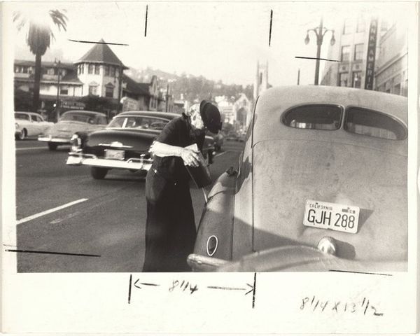 Curator: This photograph by Martin Schweig presents a fascinating look at the materials and context surrounding a mid-century wedding. The car, the clothing, even the handwritten sign – each element tells a story of production and consumption. Editor: It certainly does! It appears to show the back of a wedding car with the sign "Just Married" hanging on it, and a woman watching. What do you see in this piece in terms of materials and social context? Curator: The car itself is a prime example of industrial production and status. And consider the sign—a handmade object juxtaposed with mass-produced items. The inscription speaks volumes about gender roles and expectations of the time. How might the materials used reflect the social dynamics? Editor: That is thought provoking. Thank you for making me see the layers beyond the surface! Curator: It highlights the labor, materials, and consumption interwoven into seemingly simple moments.