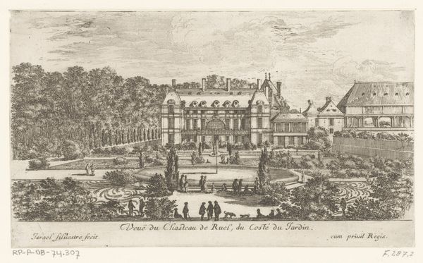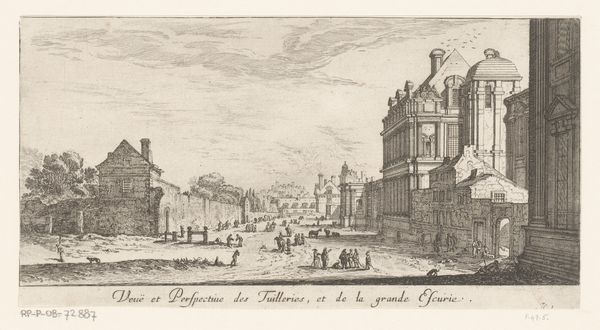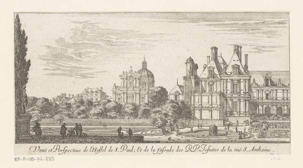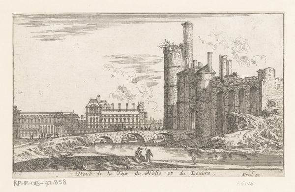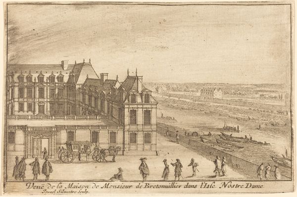 Curator: This etching, "Stadsgezicht van Parijs met het huis van de hertog van Luynes," or "Cityscape of Paris with the house of the Duke of Luynes," by Israel Silvestre, created in 1652, offers a glimpse into 17th-century Parisian life. Editor: My first thought is of immense privilege. Just look at that mansion dominating the scene! Even rendered in fine lines, the opulence practically jumps off the page. Curator: The image definitely speaks volumes about the distribution of power. Silvestre’s baroque style lends itself to emphasizing the grandeur of aristocratic architecture. One could examine the power dynamics inherent in representing such structures while perhaps sidelining the lives of everyday Parisians. Editor: It’s also fascinating how the architecture almost merges with symbolic implications of power, right? Note how the arches mimic classical Roman triumphal entrances. I can imagine the Duke of Luynes subtly aligning himself with powerful leaders. Curator: Precisely. Silvestre was, in effect, creating visual propaganda. This particular view invites us to dissect the underlying socio-political motives driving such commissions. We must ask, whom did such imagery serve and who was deliberately excluded? Editor: The river Seine also catches my eye. It looks almost like a liquid artery, both a practical resource and a symbol of constant change and commerce. Even here the larger vessels may be those connected to nobility, transporting commodities. Curator: And perhaps ideologies as well. Notice the almost insignificant scale of the people; they seem deliberately minimized in relation to the monumental structures, further cementing a distinct social hierarchy. That’s an important visual comment regarding the place of everyday citizens. Editor: Studying images such as these gives insight into the enduring presence of visual markers signifying authority and social stratification. They resonate even today in very visible or, at times, subliminal messaging. Curator: Yes, critically analyzing images like Silvestre’s work from 1652 invites reflection on both historical hegemonies and contemporary socio-political representation. Editor: Absolutely. Thanks to pieces like this, we’re continuously made aware of symbols, old and new.