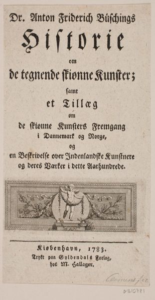 Editor: We're looking at a title vignette for "Afhandling over den ældre skandinaviske historie," or "Treatise on Older Scandinavian History," from 1781, made by J.H. Rawert. It looks like it was made using printmaking, specifically engraving. It feels very illustrative. What stands out to you when you look at this? Curator: What strikes me is the interplay between the overt declaration of history and the means of production. Consider the engraving process itself: a laborious, artisanal technique deployed to disseminate ideas, mass produce the title page, in an emerging print market in the late 18th Century. How does this influence and democratise access to historical scholarship? Editor: That's an interesting point. I hadn’t thought about it in terms of democratization of knowledge. Curator: Look at the imagery: a woman seemingly being blessed or aided by a winged figure within a cavern, with old inscriptions on what could be old carved monuments. Are these scenes merely decorative or representative of something of societal and political importance related to Danish historical identity? Rawert made a choice in depicting such a scene; it is more than just aesthetic preference. Editor: It's interesting how the image, as a mass produced object, attempts to add authority to a field such as history. I wonder who had access to it, and how it circulated? Curator: Precisely! Understanding the social circulation of prints like these is key. It helps reveal their role in shaping national narratives, consumer behaviour and what it means to experience the past through material culture. It forces us to re-evaluate what is merely seen as decorative art as central to larger issues of accessibility and dissemination. Editor: That’s a really interesting way of looking at it. Thanks! Curator: My pleasure. Considering the historical, societal context makes you examine beyond just the artistic surface.