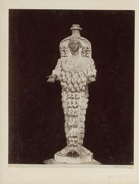 Editor: This is a photograph titled "Afgietsel van een waterspuwer van de Kathedraal van Troyes," taken by Médéric Mieusement sometime between 1875 and 1900. It's a gelatin silver print depicting a cast of a gothic gargoyle. I'm struck by how it captures the grotesque and somewhat pained expression of the figure. What is your take on it? Curator: The photograph brings to mind the fascination with medievalism that swept through 19th-century Europe. Figures like this gargoyle served not just a structural purpose on gothic cathedrals, diverting rainwater, but also a symbolic one – warding off evil spirits. This photograph, as a *reproduction* of that gargoyle, participates in a larger cultural phenomenon of re-interpreting the medieval past through a romantic lens. Do you think displaying a reproduction of a religious sculpture for public view changes its purpose? Editor: That’s a fascinating point. Yes, removing the gargoyle from its original context – a functioning, spiritually charged cathedral – and placing it in a museum, transforms it into an object of aesthetic and historical study. It’s lost some of its power, maybe, but gained another kind of significance. Curator: Precisely! This act of photographing and disseminating images of gargoyles through prints served to democratize access to art and architecture, previously exclusive to those who could physically visit these sites. However, it simultaneously risks stripping the object of its original meaning. Does this photographic rendition enhance or detract from the gargoyle's perceived importance in society? Editor: I think it's both, really. The photograph makes the gargoyle more accessible but also flattens it, reducing it to a two-dimensional object that can be consumed and collected. I learned so much about seeing reproductions as both an advantage and potential pitfall. Curator: I concur! Analyzing photographs like these offers us invaluable insights into the shifting perceptions and socio-political dynamics of the past, regarding public art display and cultural preservation.
