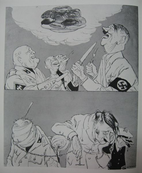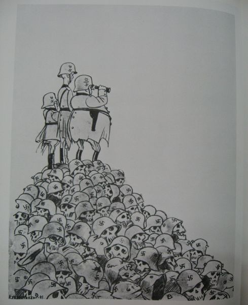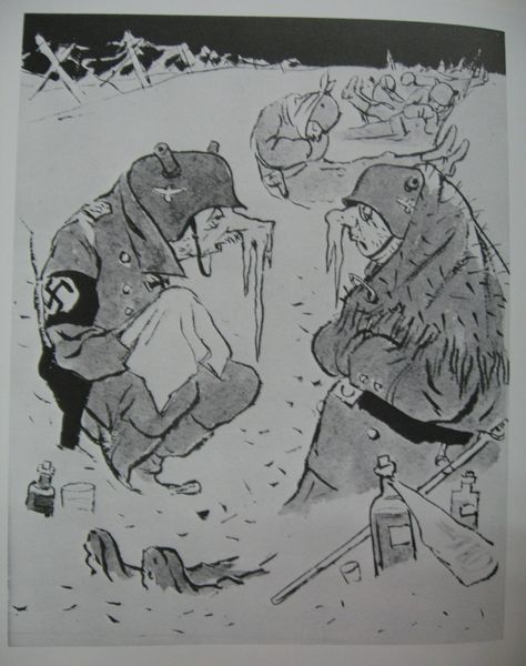This ink drawing was made in the Soviet Union by the collective Kukryniksy in 1942. Here, pig-like caricatures of German soldiers are shown destroying a bust of the Russian writer Nikolai Gogol. This propaganda image relies on strong nationalistic sentiments. It plays on the tradition of glorifying writers and artists through monuments, which began in the 19th century. The destruction of the bust is symbolic of the wider destruction of Russian culture by the invading Nazi forces. The Nazis are presented as savage and animalistic. Depicting them as pigs is intended to be dehumanizing and insulting. It served the important public role of inciting hatred and mobilizing resistance against the invaders. To understand this image better, we can research the histories of Soviet propaganda, 19th-century monuments, and wartime political cartoons. The meaning of the artwork relies on historical, social, and institutional contexts.