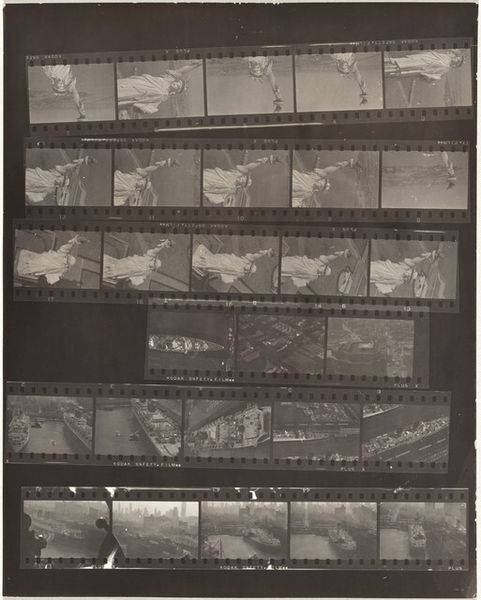 Curator: Here we have Robert Frank's "Paris 47A," created between 1949 and 1950. What strikes you immediately about this contact print? Editor: The grittiness, definitely. It’s all about process. You see the marks, the imperfections, it makes the images more immediate somehow, less polished. It doesn’t try to hide its nature. Curator: Frank’s work, particularly in the post-war era, often pushed against the romanticized views of places like Paris. Instead, he documents the everyday, the raw textures of the city. Editor: Absolutely. And looking at the medium itself - a contact print – it screams process. You can see the full sequence, every shot he considered. It demystifies the photographic act, shows the work that goes into even fleeting images. The film edges emphasize the commercial element, of photographic materials, while hinting at possible editing choices and image sequencing as integral parts of its meaning. Curator: The format almost echoes the way archives organize and display their findings. It begs the question of which photographs "make the cut," and, furthermore, how this final selection becomes the historical narrative of Frank’s practice. The repetition across the frames gives a kind of rhythm, doesn't it? Editor: Yes! A labor rhythm. It connects the high-art presentation to the physical act of photography – developing, printing. It isn't about the grand narrative but about repetitive labor, and by extension it's about accessibility, about showing photography as something made, something worked at. Curator: This piece also anticipates Frank’s later, more famous work, "The Americans," both in subject and tone. It's the quiet observation of life. It’s the reality without romanticizing it. Editor: And for me, seeing that labor, seeing the work that has to go in. That the raw materials are elevated and placed center-stage to remind me that any artist – a photographer in this case – starts with some pretty mundane components: the camera, the materials, but also that they need something like opportunity and luck in the equation. Curator: Considering Frank's other pieces, I think it makes me appreciate seeing his progression in style. We’re capturing that raw emotion as part of an historical era through different cultural contexts. Editor: I see in "Paris 47A" the essence of Robert Frank as someone who exposed photography, stripping it bare in order to humanize his images of the city and its making.