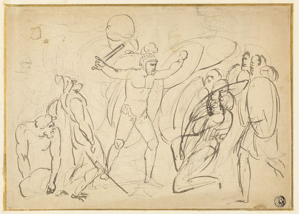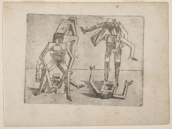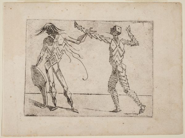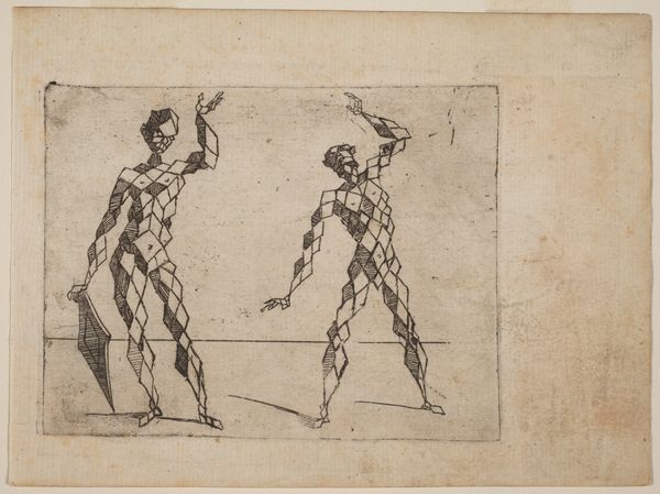 Curator: This engraving, dating back to 1624, is by Giovanni Battista Bracelli, and is part of a series called "Bizzarie di varie Figure." Editor: It’s… certainly bizarre. They seem to be constructed entirely out of rackets. There’s an almost playful, unsettling quality to their forms. Curator: It's important to remember the artistic climate of the time. Bracelli worked in the Mannerist style. That meant deliberately distorting forms, playing with perspective, and pushing against the High Renaissance ideals of harmony and realism. He seems fascinated by the possibilities of abstraction. Editor: Fascinating! How does his work fit into the broader context of printmaking at the time? This particular image really gets you thinking about how prints were produced, sold and valued. This sort of challenges assumptions about authorship and value, especially given that prints often had a wide circulation. Curator: Well, the "Bizzarie" series was likely produced in an artisanal workshop, catering to a wealthy, educated elite with an interest in intellectual games and visual wit. This would have been distributed widely in printed form and perhaps also appreciated as singular, fine art objects by collectors. The engraving technique itself involved skilled labor, transforming metal plates through carefully applied pressure. Editor: These racket-figures seem very self-conscious about being artworks! There’s definitely a knowing commentary on the artistic conventions. The tools are standing in for the figures! What statement do you think Bracelli was trying to make on artistic production at this time? Curator: The choice of rackets, or other everyday objects forming figures could be read as democratizing art. By creating these human forms, it reflects on the broader societal changes of his time. Also, consider how institutions—academies, patrons—influenced the production of images and the opportunities available to an artist. Editor: That is insightful. It's remarkable how much complexity arises from what initially seems like a simple, strange composition. It has shifted my view completely. Curator: It’s the enduring power of art to stimulate conversation across centuries!