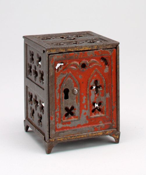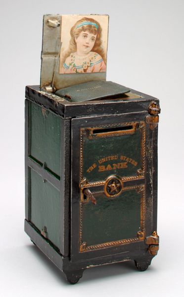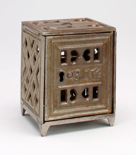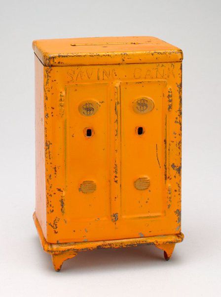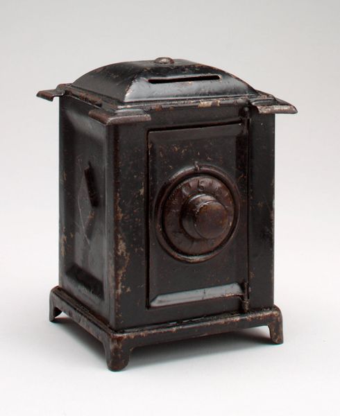 This -Columbia Bank- still bank was made out of cast iron in Columbia, Pennsylvania. It shows the inherent qualities of cast iron through its substance, weight, and form. The iron was heated to a molten state, then poured into a mold shaped like a miniature bank safe. The process involved skilled labor in the factory, reflecting the growing industrialization of America at the turn of the 20th century. The bank's solid feel and durability convey a sense of security, meant to encourage thriftiness in children. The green and black paint, now worn with age, suggests the bank was meant to resemble a real safe, teaching children about saving money and participating in the economic system. By considering the materials, the making process, and the social context, we can appreciate the still bank as more than just a child’s toy, but as a reflection of America’s industrial age.