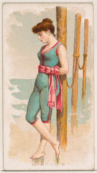 This small chromolithograph, Isle of Shoals, New Hampshire, was created by Kinney Brothers Tobacco Company as part of their “Surf Beauties” series. Made during an era of increasing industrialization and urbanization, these cards offered an idealized vision of leisure and beauty. Yet this image also speaks to the constraints and expectations placed on women at the time. Here, a woman is depicted in a bathing costume that covers much of her body, reflecting the modesty expected of women in public spaces. Her gaze is directed downwards, embodying a demure posture. The image raises questions about the representation of the female body in the late 19th century, and how commercial images contributed to the construction of gender roles and societal expectations. While seemingly innocent, the Surf Beauties subtly enforced the era’s conservative norms, reminding us that even images of leisure can be laden with cultural meaning.