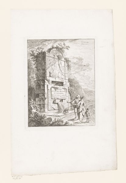 Editor: So, this is "Ruins of an ancient tomb in front of ruins of an ancient aqueduct…" Quite a mouthful! It’s by Giovanni Battista Piranesi, from 1743. It looks like an etching and engraving – so, ink on paper. Honestly, it makes me feel a bit melancholic, seeing these grand structures all broken down. What do you see in this piece? Curator: Melancholy is a good starting point, isn’t it? It makes me think about time itself, not in a linear sense but swirling, like dust devils in the Roman Forum. Piranesi wasn’t just documenting ruins; he was reimagining them, almost reliving their epic collapse, and layering in something of the sublime, you know? Have you noticed how he plays with scale, how tiny those figures are against the immensity of the crumbling aqueduct? Editor: Yes, they look almost like ants! Deliberately so, I imagine? Curator: Precisely. It accentuates the insignificance of humankind when pitted against the march of time and decay. Also, notice the obsessive detail? Each crack, each broken stone seems to hold a story. What do you think Piranesi is trying to communicate by focusing so much on architectural ruins? Editor: Maybe he’s commenting on the impermanence of power? The might of Rome eventually crumbled… It’s like a memento mori but on a grand, architectural scale. Curator: Memento mori… Yes! I think you’ve hit on something essential. He’s using the grandeur of the past to comment on the fragility of the present, maybe even hinting at the hubris of believing anything will last forever. Gives you chills, doesn’t it? Editor: Definitely! It’s way more profound than just a pretty landscape. It is a punch in the gut from history. I will never look at another landscape the same way again! Curator: My work here is done then! Just remember, all art whispers secrets; some just shout a bit louder than others.