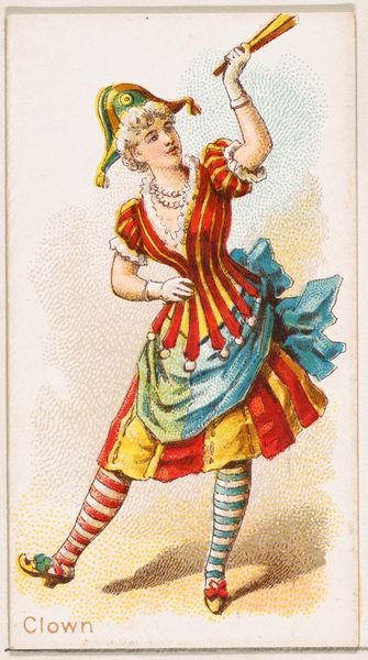Editor: This is "Roman Dancer," a colored pencil drawing and print made around 1889 by William S. Kimball & Co. It's quite small, presumably a trade card, and the dancer herself strikes a very deliberate, almost theatrical pose. What sort of symbols jump out at you? Curator: The most prominent is the laurel wreath. In Roman iconography, it's a powerful symbol of victory, triumph, and honor, closely associated with emperors and military leaders. She's offering it, presenting herself *as* victory. But who is she victorious *over*, or for? Does that read more as hubris or offering? Editor: It feels like both at once! The rosy coloring and delicate lines suggest celebration, but that stern expression suggests something much more rigid. Curator: Precisely! Look at how the artist uses color and line to create tension. The gold ornamentation speaks to status and wealth, but her almost severe gaze hints at a deeper complexity. Remember these trade cards often presented idealized images. The symbol’s initial intention probably diverges quite far from our contemporary reading of it. The dance itself--is it celebration or performance? Editor: That’s fascinating, seeing the laurel wreath, which I would normally associate with something purely positive, used in this much more layered way. It really does make you question the nature of victory and performance in that time. Curator: Yes! It speaks volumes about cultural memory. How symbols evolve, retaining echoes of their original meaning while acquiring new nuances with each generation. Perhaps a tool of empire, reshaped for a burgeoning consumerist republic. Editor: So, reading images through cultural memory lets us see how even a small trade card like this holds a whole world of meaning. I'll definitely look at things differently now. Curator: Exactly! Always question the surface, and delve into the symbols that resonate through time.