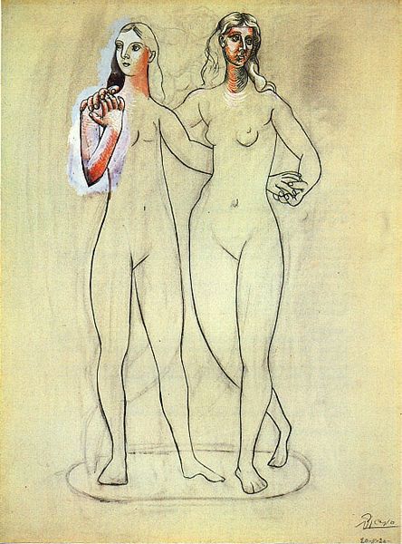 Curator: Pablo Picasso's "Two Nude Women," created in 1906, offers us a fascinating glimpse into his stylistic evolution, right before he fully embraced Cubism. Editor: It feels so raw, doesn’t it? Like looking at someone's sketchbook page. I'm struck by the vulnerability in their faces and how the light catches their forms. Curator: Indeed. This work comes from a period marked by Picasso's experimentation with Iberian sculpture and Primitivism, reflecting a broader interest in non-Western art and a desire to move away from classical representation. How does it speak to current discourses surrounding the female gaze and objectification? Editor: It’s funny because at first glance, yes, two nude women painted by a male artist. But there's a quiet intimacy here. Their touch seems to ground them in mutual support, a shared, almost sisterly acknowledgement. It transcends objectification, landing more softly in the space of acceptance. It's very touching. Curator: I agree. The composition invites us to consider these figures not just as objects of aesthetic contemplation, but as subjects. The roughness of the drawing, the deliberate distortions – these disrupt any comfortable viewing position. It begs us to think about gender and representation beyond Western art history canon. Editor: I love that "roughness." The scribbled lines behind them—it is kind of a wall or a chaotic energy swirling around? It amplifies the mood in the foreground. You can see how the energy comes out from the body too. Like how they can just exist. Curator: Looking at Picasso through a feminist lens complicates his legacy but also allows for richer insights into the cultural anxieties surrounding the depiction of women during that era. The blend of vulnerability and strength that emerges makes a nuanced contribution to our current conversations. Editor: Totally. It’s a conversation starter. You get lost staring at the space between the art, the figures, and where you stand with it. Curator: An invaluable glimpse into Picasso's artistic journey. Editor: Yes, a soulful moment caught in time.