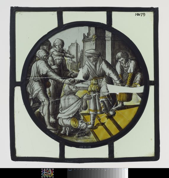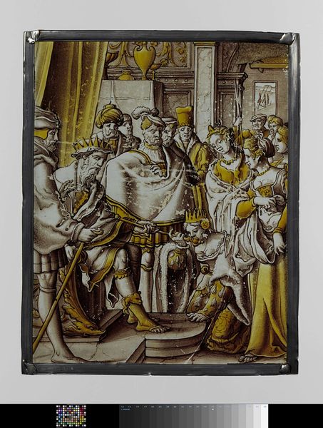 Editor: So, this artwork is *Bruiloft te Kana*, or *The Wedding at Cana*, made around 1550 by Jan Swart van Groningen. It's a tempera on glass piece, currently housed here at the Rijksmuseum. It strikes me as surprisingly intimate, considering it depicts a miracle! The everyday activities sort of overshadow the…divine aspect. What catches your eye, Professor? Curator: Ah, a wedding feast, yes! And what catches *my* eye? Well, isn’t it just overflowing with…life, wouldn’t you say? A boisterous celebration contained within a, rather unusual, glassy frame. Jan Swart really packs in the detail. Have you noticed how he plays with space, layering figures upon figures, drawing our gaze to various pockets of action? Do you feel like you could step right into the party? It is a wonder this image survived. Editor: I do see that! All the different depths in the glass give it an airy feel. But do you think it makes the story of the miracle less central? Because the eye goes straight to the foreground servers... Curator: Less central, perhaps, to *our* contemporary eyes, yes. However, for the Renaissance viewer? Remember, art like this often served a didactic purpose. Swart isn’t just illustrating the biblical narrative. He’s creating a world, an immersive experience where the miracle feels immediate, and truly within the viewer’s own reach, a shared human experience. Imagine, just for a moment, seeing *Bruiloft* not just as an art object, but as a beacon, wouldn't it make you marvel and contemplate a different time? Editor: That's really interesting, that completely changes how I perceive it! Instead of a scene, it's more of an…invitation. A doorway to wonder! Curator: Precisely! And that, my dear editor, is often the greatest miracle of art itself! Editor: Thanks, that helps me understand so much better, looking at it in a period-centric way, it opened a world.