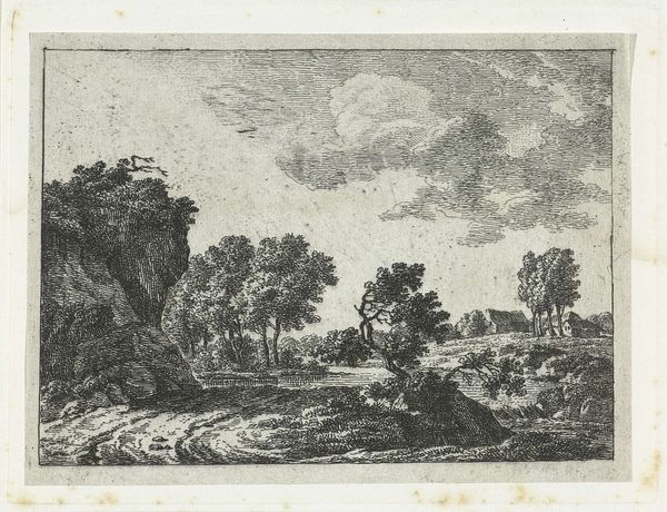 Curator: Let's consider "Landscape with a Man, Woman, and Child," an etching from the period of 1637 to 1679, attributed to Philips Augustijn Immenraet. Editor: It's a beautifully rendered landscape. Even though it's small, the textures give it a very intimate feeling. The eye travels from the couple resting beneath the trees to the town below. Curator: Indeed. And its genre scene situated within the landscape compels us to ask about social structures and the ways in which identities are being staged in relation to the environment. Look at how they are physically placed in relation to nature and the cityscape. What commentary is Immenraet making on this placement? Editor: The figures seem small, almost incidental, compared to the powerful presence of the cliff and the distant village. Birds appear scattered across the top third, but perhaps that smoke conveys a message. The scene seems carefully arranged, leading the eye through these distinct layers. It evokes feelings of security within this ordered world. Curator: Absolutely. One lens through which to consider the hierarchy here is class and power, as defined through labor. Editor: Those flying birds are a fascinating, reoccurring element, as their scattered composition directs our gaze up and around this meticulously crafted vista. Are those flocks heralding changing weather? Curator: Or could their flight symbolize the limited agency of some, as people who may find themselves tethered by obligations rather than unbound freedoms? It would seem this detailed landscape contains the symbols that reinforce prevailing political and social hierarchies. Editor: Fascinating, viewing them as representative of restricted freedom in the period; I am certain that future visitors can find that concept insightful when exploring this composition more deeply. Curator: Agreed, I invite future viewers to engage with the themes presented within the piece as they reflect on the socio-economic constraints as imposed within Immenraet’s era.