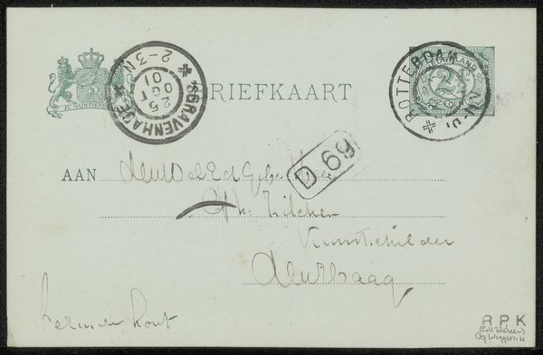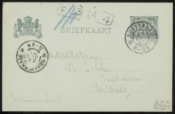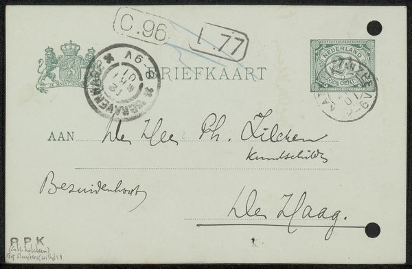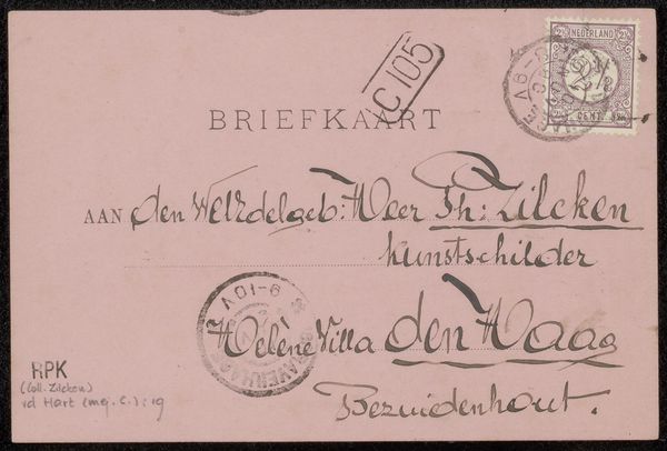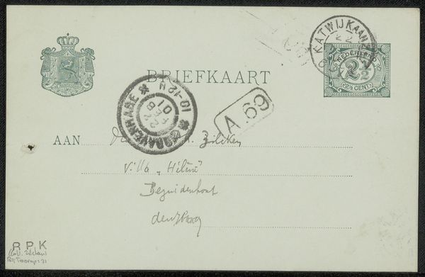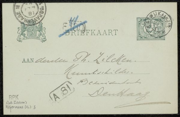 Curator: Looking at this work, "Briefkaart aan Jan Veth" by Antoon Derkinderen, likely created sometime between 1902 and 1909, I'm immediately struck by its intimacy. It's mixed-media on paper, a personal artifact transformed into a piece for public viewing. What's your first impression? Editor: My eye is drawn to the script—elegant yet utilitarian, it tells a story of connection. There’s something inherently powerful in seeing communication stripped down to its most fundamental form, especially in this age where much of our communication is mediated through screens. Curator: Indeed. The letter form itself provides crucial context. Derkinderen addresses Jan Veth, an artist, critic, and intellectual deeply involved in the cultural and political dialogues of the Netherlands at the turn of the century. The choice to send a “Briefkaart,” rather than a more formal letter, suggests an immediacy or casualness to their relationship. Editor: I agree. Seeing Veth named there suggests more than just acquaintances. Knowing that Veth's writings championed social justice and workers' rights adds another layer, positioning this simple postcard within that larger progressive movement in art and thought. Do you see the stamp and postal markings playing a role? Curator: Absolutely. These elements anchor the piece within a specific time and place. The postmark "Bussum" and the Dutch stamp mark this card with nationhood and locality—these markings assert its origins. Beyond that, the use of a pre-printed postal card—an item sold by the state postal service—tells a broader story of standardization and the increasing interconnectedness fostered by such services. Editor: You are right. But there is another message beyond this formal delivery and stamp that cannot be understated. To witness something so inherently tied to one individual's life preserved like this brings attention to what and whose life, narratives, and ephemera become preserved. It beckons reflection upon questions regarding representation and power that still echo loudly through society. Curator: Well, by examining what remains we are challenged to ask critical questions about art's function beyond pure aesthetics. Editor: Exactly! By studying works like these, with their intersections of art, social critique, and personal correspondence, we deepen our understanding of a historical period, and hopefully inspire crucial change going forward.