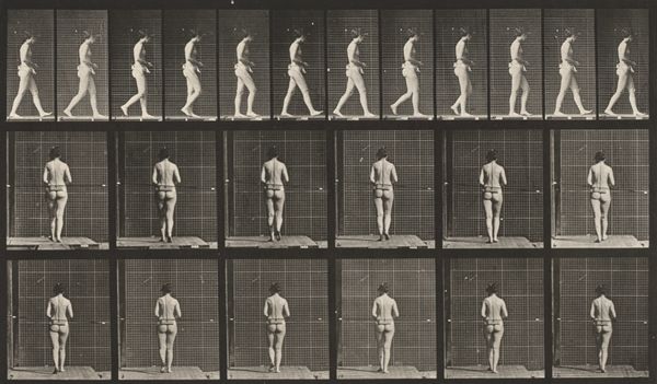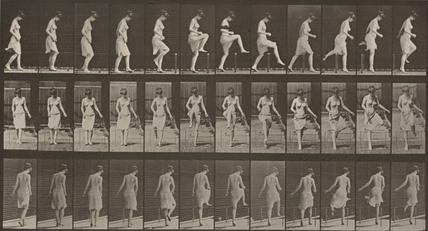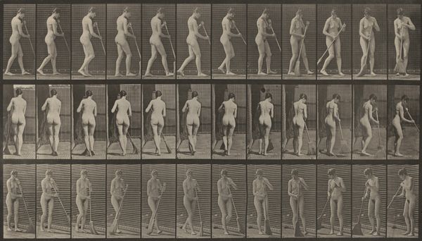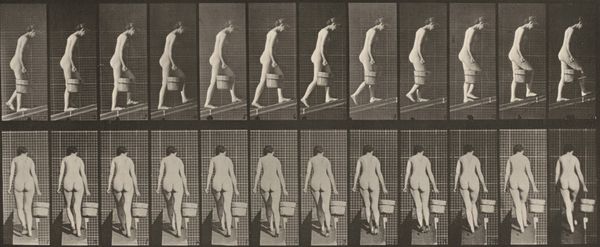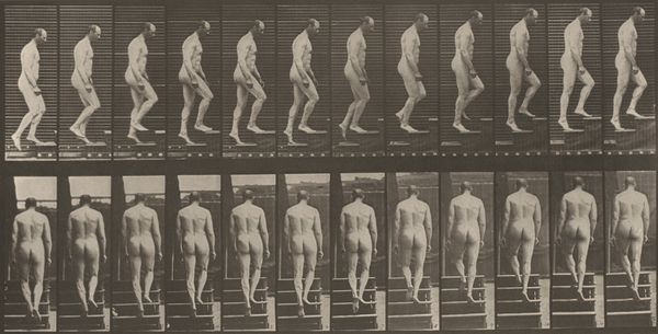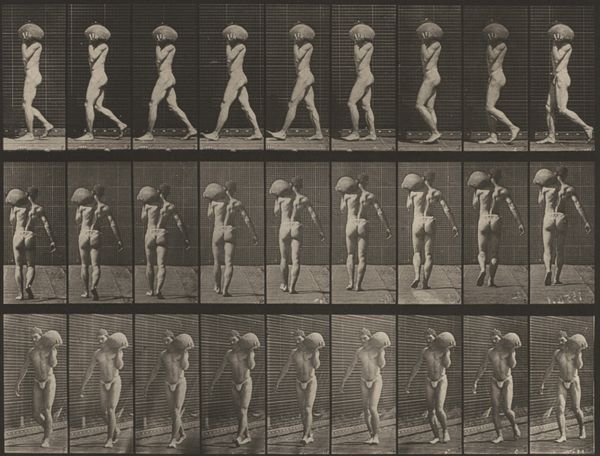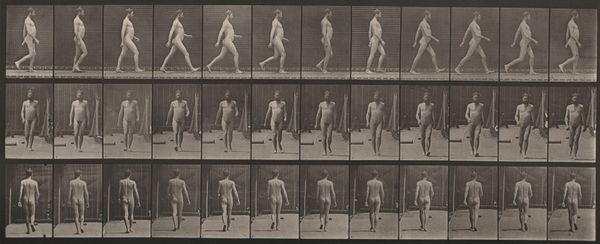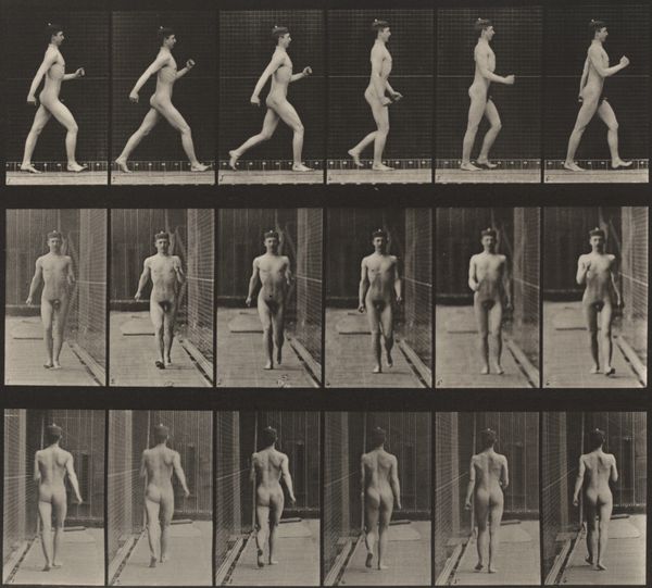 Editor: We are looking at "Plate Number 13. Walking," an 1887 gelatin silver print by Eadweard Muybridge. What strikes me is how clinical it feels. Almost like a scientific document rather than a piece of art. How do you interpret this work, particularly in the context of its time? Curator: It's crucial to understand that Muybridge's work transcends simple scientific documentation. Yes, it served scientific purposes, but let's consider the late 19th century, a period rife with discussions about the "primitive" versus the "civilized," often through a racialized and gendered lens. How does presenting a nude female form in sequential motion potentially reinforce or challenge these existing power structures and social biases? Editor: So, beyond just capturing motion, you're suggesting this work engages with ideas around the body, gender, and even Victorian societal norms? Curator: Absolutely. Photography itself was a relatively new medium. Consider the gaze – who is invited to look, and what does it mean to dissect a female figure in this way? Does the seriality and almost anatomical precision invite objectification, or can it be viewed as an empowering study of movement, disrupting the male artistic gaze that typically dictated how women were represented in art? And also consider how race plays into these social norms. Where would non-white bodies fit within Muybridge's work? Editor: I never thought about the perspective of the Victorian viewers and that contrast between scientific documentation and objectification. Curator: Exactly. It compels us to consider how science and art aren’t neutral; they operate within existing frameworks of power and influence. Muybridge's photographs become a powerful site for exploring those tensions and societal concerns, like gender dynamics and even colonial ways of seeing and cataloguing. Editor: It is so interesting to think of it now with all of this in mind, instead of seeing it simply as one of the early steps of photography and cinema. Thank you! Curator: Indeed. Viewing art as a historical document deeply embedded in its socio-political environment adds richer layers to its apparent simplicity.