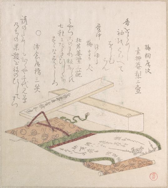 Curator: Standing before us is “Tenman Shrine Bell,” a print made by Nakagawa Rogetsu around the 1860s. It's crafted with ink and watercolor on paper, and currently held here at The Art Institute of Chicago. Editor: My first thought? Dreamlike. It’s mostly soft pastels, and those falling cherry blossoms—it's like a poem caught mid-breath. I’m curious about that bell... what is that bell? Curator: Bells in Shintoism have many layers, typically functioning as a locus to call the divine or to remove malevolent forces, which sounds rather dramatic! But there are some who might suggest it serves more pedestrian functions such as indicating the presence of a sacred space and warding off unwelcome intrusions, whether that be a stray animal, bad intentions, or uncleanliness. And shrines dedicated to Tenman, who is considered the god of scholarship, suggest devotion and auspicious wishes for intellectual attainment. Editor: Oh, I love that it wards off the unclean—both literally and symbolically. And thinking about Tenman, the god of scholarship... seeing those cherry blossoms with the calligraphy, it's as if knowledge itself is falling, like the petals, waiting to be gathered. Curator: Consider how these floating blossoms contribute to ukiyo-e art, offering ephemeral beauty. Ukiyo-e, with its roots in the fleeting moments of everyday life and pleasure, often incorporates elements suggesting cycles of transformation: cherry blossoms being such powerful signsifiers as they’re intrinsically transient. How their fleeting beauty mirror our aspirations, hopes, even intellectual pursuits? Editor: It’s all rather moving when you see that symbolism right there. And seeing that bell, too, with the six-petal design... Does that particular image have significance beyond decoration? Curator: Most likely, yes. Considering its presence on the bell suggests direct engagement with divine association. Bells, especially, mark boundaries, bridging earthly spaces with spiritual domains. Consider that its function being directly tied to calling upon celestial powers, especially at temples! Editor: Makes you think about the role of art in making those connections tangible, doesn't it? We get to participate in something bigger, some ongoing dialogue. It's really so beautiful and peaceful! Curator: The artist has succeeded if we ourselves have felt even a little bit connected to that cultural continuity. Thanks for musing along. Editor: Yes, it was great reflecting together on this lovely little artwork.