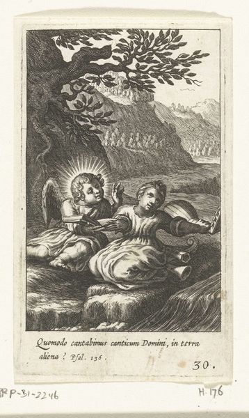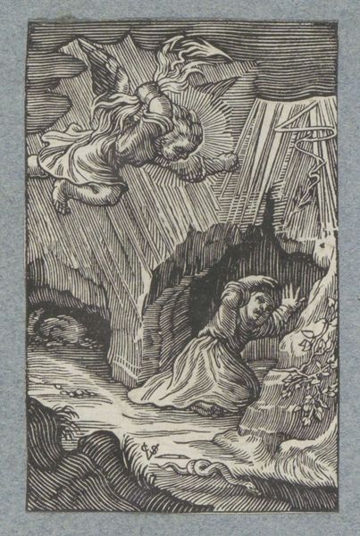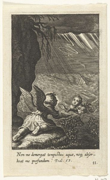 This tiny engraving, "Kind schuilt voor onweer in grot," was made by Boëtius Adamsz. Bolswert. Notice how light becomes a structural element. The dramatic scene is composed of a dark, cloud-filled sky unleashing rain as sharp vertical lines. This contrasts with the cave where a child is sheltered. Above, an angel seemingly flies through the storm. The composition directs our gaze from the tempestuous sky down to the relative safety of the cave, using light to model form and create depth. The engraving employs a semiotic system where darkness and light signify danger and safety. The angel, a sign of divine intervention, destabilizes the natural threat of the storm. The serpent in the lower register suggests not only the inherent presence of evil and temptation but also the necessity of divine intervention. The linear precision and contrasting tones serve not only to depict a scene but also to engage with philosophical questions around safety, danger, and divine intervention. The artwork functions as a site of ongoing interpretations about the human condition.