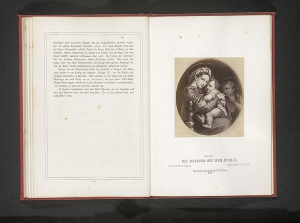 Editor: Here we have a photographic print, before 1866, depicting what is thought to be a painting of the Virgin Mary nursing the infant Jesus. The style feels reminiscent of the Italian Renaissance. What strikes me is how this intimate moment is captured with such formality, even reverence. What do you make of this image? Curator: This photographic reproduction offers us a layered glimpse into cultural memory. The enduring image of Mary nursing Jesus—the *Madonna Lactans*—carries tremendous weight. Here, captured through the relatively new medium of photography, it invites reflection on how religious imagery adapts and persists. Consider the original painting, likely intended to inspire devotion, and this later photograph, serving a documentary purpose. Editor: So the photograph transforms the original image into something… different? How does its symbolism shift through the photographic lens? Curator: Precisely. Photography, with its indexical nature, imbues the scene with a different kind of "truth." The vulnerability of the nursing mother—a timeless symbol—gains a sharper, more tangible dimension, accessible to a broader audience through its circulation in printed form. What feeling does that instill within you? Editor: It feels more… human. Less ethereal, maybe. Curator: Indeed. And how does that feeling echo with the knowledge of the human story this artwork speaks to, over centuries? Editor: Thinking about the historical timeline, from original painting to photographic reproduction, is helpful to me. I see it now less as a picture and more as an echo of a significant cultural symbol. Thanks!