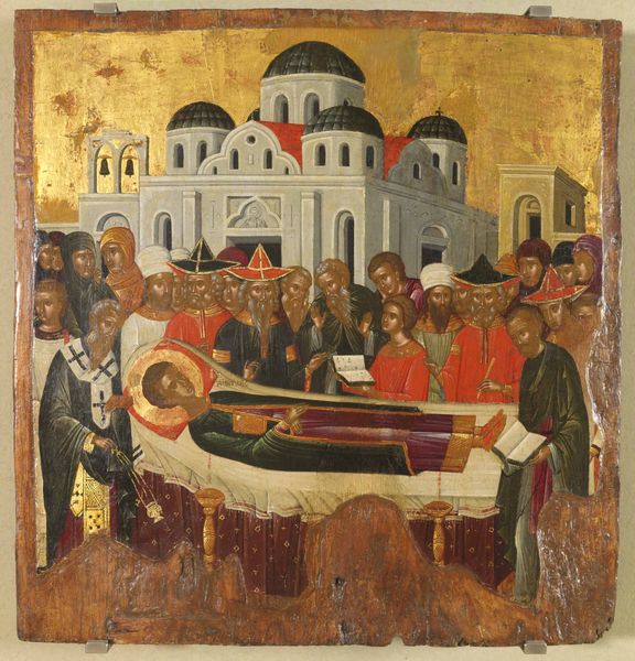 Editor: This tempera on panel, "Outlaying of Mary's Corpse with Mourning Saints," dates back to 1300. Its location is listed as Saint Catherine's Monastery in Mount Sinai. The emotional tenor strikes me immediately; a somber, almost oppressive grief permeates the scene. What historical weight does a piece like this carry? Curator: The cultural context here is paramount. Byzantine art, flourishing during the Medieval period, served not merely as aesthetic objects, but as crucial conduits of religious and political ideology. Icons, in particular, held immense power. Think of the social function this painting held. Editor: Like, to guide and remind? Curator: More than that: the painting is there for validation, teaching and to present authority to believers of what they should align their beliefs to. In Orthodox tradition, the Dormition, or falling asleep, of the Virgin Mary is a pivotal moment, but why represent it in such a stylized manner, almost a flattened perspective? Consider what this image *does,* beyond what it *shows*. How might this painting influence a viewer's understanding of authority within both the church and broader Byzantine society? Editor: So the very *style* reinforces established power structures? The flattening, the strict composition... it’s all deliberate? Curator: Absolutely. Notice the rigid postures, the halos signifying sanctity, the positioning of Christ receiving Mary’s soul. Everything reinforces a specific theological and social order. How do you think the average worshipper encountered images like this? Editor: Presumably with a degree of reverence and perhaps even awe? To see such grand people portrayed as if they were to pass down as important lessons must affect many in their lives. Curator: Precisely. This wasn’t just art for art's sake. It was a carefully constructed message, shaping beliefs, behaviors, and reinforcing established power structures within the Byzantine world. And consider the location; Saint Catherine's, far from Constantinople, becomes a crucial outpost for disseminating these messages. It makes you consider why only a select group can produce items like this in these specific places. Editor: That definitely makes me view it differently. I was so focused on the visual language, I missed the bigger socio-political picture. Curator: That is often the case and a learning moment to be built on!
