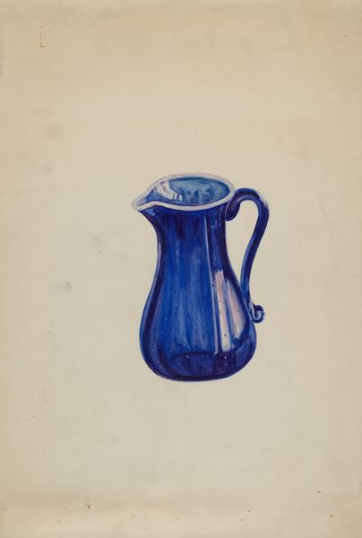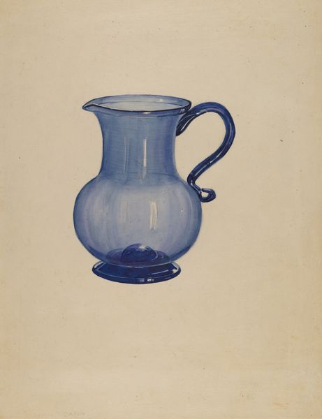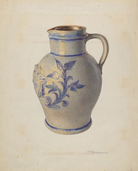Editor: This is William L. Antrim’s "Pitcher," a watercolor and drawing created around 1937. The light blues against the neutral background give it a delicate, almost dreamlike quality. What symbols or imagery stand out to you in this piece? Curator: Well, I see a pitcher adorned with what appears to be blossoming vines, possibly grapevines, rendered in a delicate blue. Vessels are deeply symbolic. They often represent the body, a container for life, and sustenance. The vines, especially grapevines, suggest themes of fertility, abundance, and even spiritual nourishment in some contexts. Editor: So the choice of a pitcher and grapevines wasn't just aesthetic? Curator: Precisely. Ask yourself: What did a pitcher represent to people in the 1930s? It would have been an essential household object, evoking domestic life and the preparation of meals, the sustaining of the family. And why this colour, blue? It signifies a spiritual understanding. Editor: Interesting! I hadn't considered the home life aspect. And the abundance, like the grapes giving sustenance during times of scarcity such as the great depression. Curator: Yes. It reflects cultural memory of struggle but a celebration of sustenance. What's curious to me, do the blue colours signify this? Editor: Yes, it could suggest reliability for our current lives. This connects so much more cultural baggage to this image! Curator: Exactly! Now, do we understand a new meaning in that water pitcher?