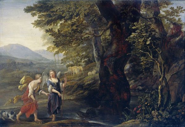 Rembrandt van Rijn rendered this oil on canvas painting, *Christ and the Woman of Samaria*, with a profound understanding of materials and their ability to convey narrative depth. The medium itself, oil paint, is key. Its capacity for layering and blending allowed Rembrandt to build up the scene gradually, using light and shadow to dramatic effect. The thick application of paint, particularly in areas like the woman's clothing and the well's stone structure, emphasizes the tangible reality of the scene. Notice how the light catches the texture of the canvas, adding a sense of depth and volume to the figures. Rembrandt's mastery of brushwork is also evident in the way he captures the subtle nuances of expression on the faces of Christ and the woman. The loose, gestural strokes convey a sense of movement and emotion, drawing us into their interaction. Ultimately, Rembrandt's choices regarding materials and techniques elevate this painting beyond a mere depiction of a biblical story. They imbue it with a sense of immediacy and emotional resonance that continues to captivate viewers today.