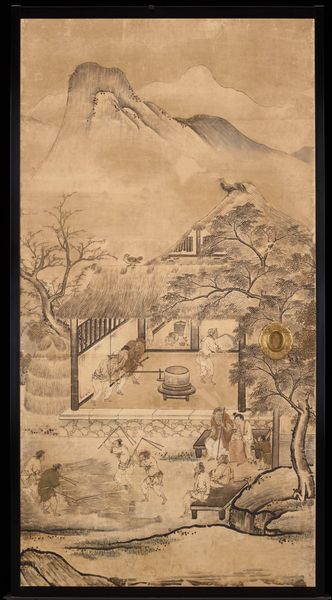 These sliding screens originally formed the four walls of a small reception chamber in Daikakuji, a temple in northwest Kyoto that alternately served as the palace for Japan's emperor. Representing the various activities associated with rice cultivation, the screens form a continuous agricultural panorama from wall to wall. Some of these chores include plowing, transplanting the rice, irrigating, threshing and grinding. Typical of paintings by artists of the Kano school, the theme derives from China and is didactic in nature. Agriculture, according to Chinese Confucian teachings, is the basis of a well-ordered society. Accordingly, when Japanese rulers adopted Confucianism as their ruling ideology, they also commissioned paintings which reflected social stability, morality and government values.Although unsigned, it is likely that these paintings are by Kano Sanraku who was commissioned to decorate the temple where these screens once existed. As head of the Kano school in the early 17th century, Sanraku evolved a style characterized by greater naturalism and detail than previous Kano artists. In addition to these characteristics, these screens exhibit a clear compositional arrangement, crisp brushwork, and heavily outlined rock formations--all hallmarks of the Kano style.
