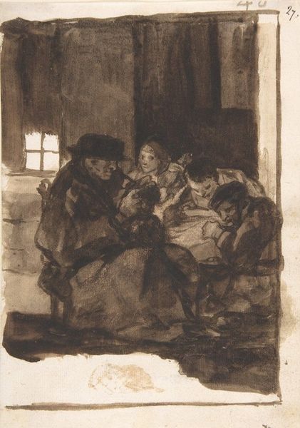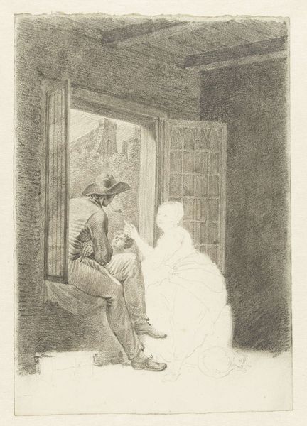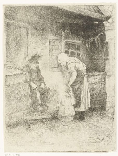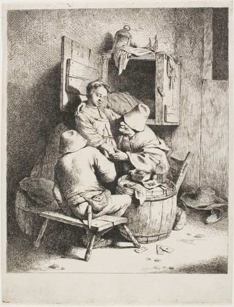 Editor: Here we have Cornelis Bega’s etching, "The Mother Seated in an Inn." It feels like a candid snapshot, capturing a quiet moment in a tavern. What do you notice in this piece? Curator: The way Bega uses light is striking. It's almost as if the scene is illuminated by memory itself. Notice how the details fade into shadow, inviting you to fill in the gaps with your own imagination. What do you think they're talking about? Editor: Perhaps they're discussing the day's wages, or sharing a joke. It's wonderful how a simple scene can spark so many stories. Curator: Exactly! Art is a mirror, reflecting our own experiences and desires. Editor: I'll never look at bar scenes the same way again. Curator: And hopefully, you will keep pondering the many stories that can live in one image.