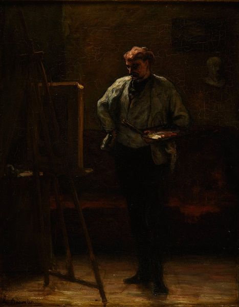 Editor: This is Józef Mehoffer's 1894 painting, "Portrait of sculptor Konstanty Laszczka," currently at the National Museum in Warsaw. It's an oil painting that strikes me as being quite intimate, almost melancholic, with its subdued palette. I’m curious, what draws your eye when you look at this portrait? Curator: What leaps out, darling, is the incredible depth within the shadows. Notice how Mehoffer hasn't shied away from darkness; instead, he's used it to frame Laszczka, almost as if to suggest the internal world of an artist at work. That crimson fez! It's the single brightest spot and leads us directly to his pensive gaze. Do you see it hinting at a quiet revolution brewing in the sculptor's mind? Editor: I hadn’t thought of it that way. It almost feels like he’s guarding a secret. And the plaster casts… they feel like echoes. Curator: Exactly! Those masks could represent Laszczka’s creations, fragments of a larger artistic vision, hauntingly emerging into reality. Or perhaps, they hint at the masks we all wear. The entire scene feels deliberately composed. And, did you notice the ladder? Perhaps signifying artistic ambition and reaching for greater heights, visually rising into the space. It's less about simple representation and more a window into an artistic soul, wouldn’t you agree? Editor: I do now. It’s a conversation about art itself, rather than just a likeness. Curator: Precisely! Mehoffer gifts us with a reflective, imaginative landscape of an artist's interior world. Marvelous! I learned something new, revisiting it with you. Editor: Me too! I'll never see portraits the same way.