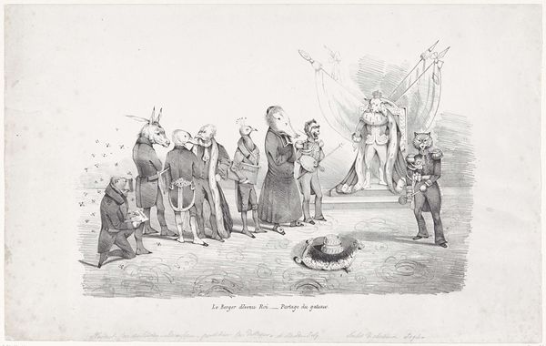 This lithograph, made in 1830 by an anonymous artist, depicts Willem I opening the session of the States-General. What might strike us most vividly is the animal heads on human bodies: an obvious critique of the Dutch government. The scene references the social and political climate of the Netherlands at the time. Willem I's reign was marked by increasing discontent, particularly in the southern provinces, which would later lead to the Belgian Revolution later the same year. The artist uses satire to comment on the perceived failings of the King and the political establishment. The animal heads serve to dehumanize the figures, suggesting a lack of reason or integrity, thus questioning the legitimacy of the Dutch monarchy and the government. Studying archival material about the press and popular opinion can reveal the extent of dissatisfaction with Willem I's rule and his policies. The availability of the free press and the rise of political cartooning contributed to the shaping of public discourse, influencing the course of history.