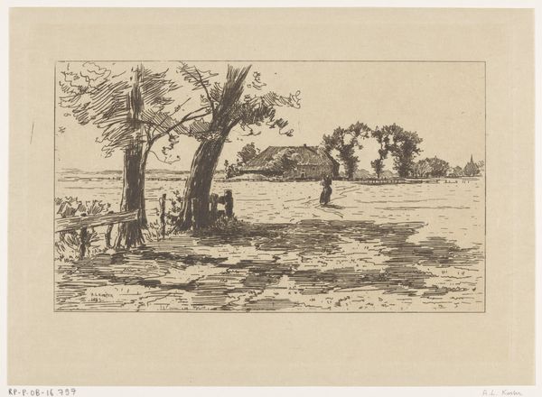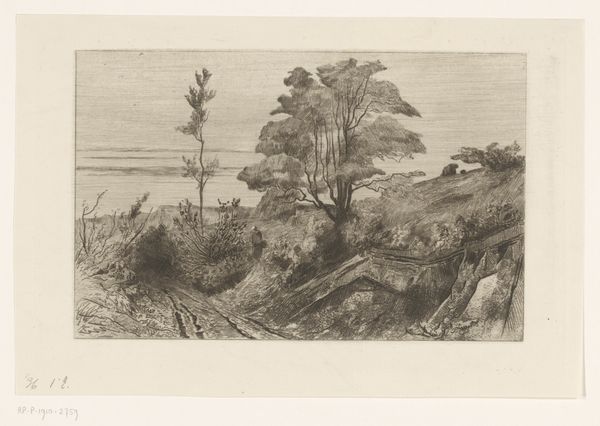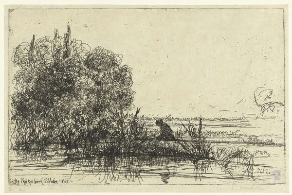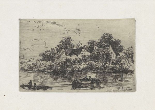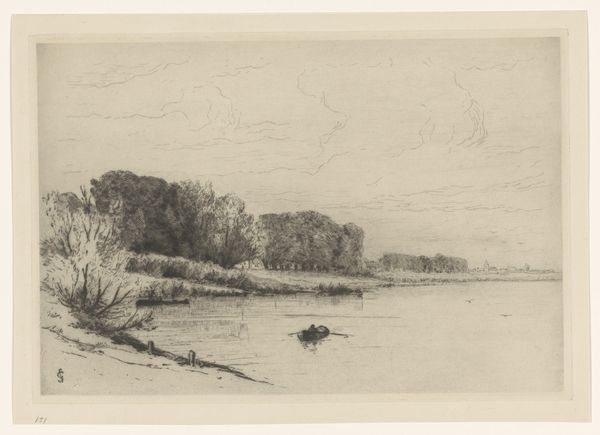 Editor: This etching, "Gezicht op de Loosdrechtse Plassen," by Carel Nicolaas Storm van 's-Gravesande, around 1880, has such a tranquil and contemplative mood. What strikes me is the contrast between the detailed foreground and the hazier background. How do you interpret this work? Curator: The print offers more than just a literal view of the Loosdrecht lakes. Consider how the image of water, endlessly reflective and ever-changing, often serves as a metaphor for the subconscious, and by extension, the human psyche. The solitary figure in the boat—what archetypes or mythic figures does he bring to mind? Editor: Perhaps Charon, ferrying souls? Or just a humble fisherman? Curator: Precisely! Both are valid. Notice how the artist uses a traditional etching technique to invoke the luminist quality typical of the Dutch Golden Age while creating an original vision. The cottage nestled under the trees on the left evokes feelings of warmth and shelter, opposing the vast open waters. It is an invitation into reverie. Do you sense a tension between domesticity and exploration? Editor: Absolutely! It’s like two worlds coexisting. The light feels incredibly important. Curator: The use of light enhances these contrasting sentiments and unites them under an all-encompassing, melancholic sky. The images and symbols invite self-reflection. We see ourselves reflected in these landscapes and water bodies. Editor: It's amazing how much depth a simple etching can contain! I appreciate the connection you've made between the landscape, the psyche, and its inherent cultural weight. Curator: I hope it invites a renewed awareness of the enduring power of art to echo and reshape our shared symbolic language.