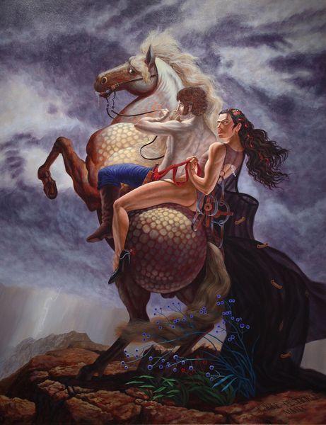 Michael Parkes, born in 1944, created "The Last Lion" using oil paints, layering them to achieve a surreal, ethereal quality. Look closely and you’ll see the smooth, almost porcelain-like finish on the figures contrasted with the rough texture of the rocks. This tension between the real and the surreal is amplified by Parkes' meticulous technique, building up layers of thin glazes to create depth and luminosity. The labor-intensive process mirrors the allegorical content of the painting. The artist’s method requires a commitment to craft, much like the angel's dedication to the lion. Parkes' choice of traditional oil painting situates the artwork within a long history of figurative representation. Yet, it also challenges the contemporary art world's sometimes dismissive attitude towards skill-based practices. This commitment to time-honored techniques elevates the work beyond mere illustration, inviting us to consider the value of patience and precision. "The Last Lion" reminds us that the true meaning of a work of art is found in the convergence of material, process, and context.