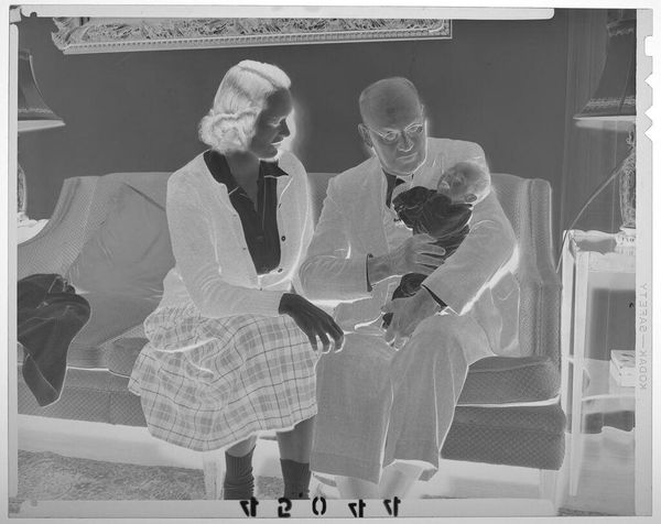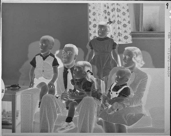Curator: This photograph, taken by Martin Schweig, depicts a couple with their four children posed on the staircase of what appears to be a very grand home. Editor: It's striking how the composition, despite being a family portrait, feels almost staged, like a tableau. Curator: Yes, there's a formality, a deliberate presentation of status and success. The architecture, the clothing...it all speaks to a specific aspiration. How does this family want to be seen, and by whom? Editor: The staircase itself is such a potent symbol, isn't it? Ascent, hierarchy, the journey upwards. It grounds the image in a long tradition of visual storytelling about ambition. Curator: Absolutely. And note the children, positioned at different levels. What does that arrangement communicate about their roles and futures within this structure? Editor: Reflecting on this image, I keep thinking about the narratives we construct around family, and how visual cues reinforce or challenge those stories. Curator: Indeed. It compels us to question who is included and excluded from the American Dream.