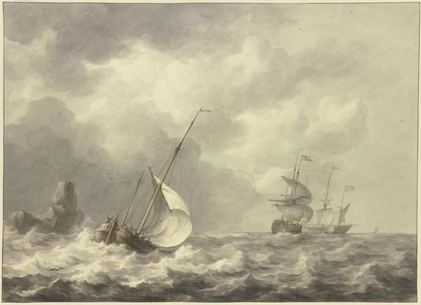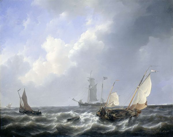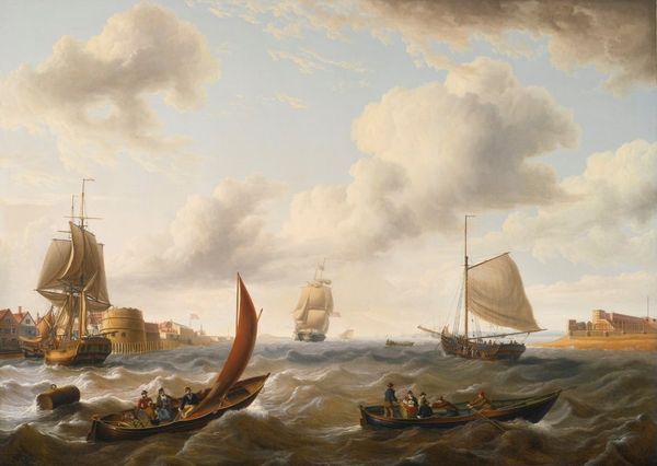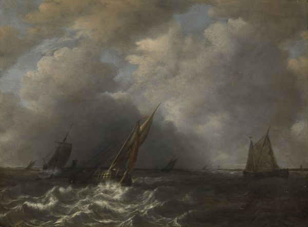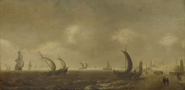 Curator: Looking at Abraham van Beyeren’s "River View," dating from around 1643 to 1650 and held at the Rijksmuseum, I am struck by its subdued palette. It feels… windswept, almost melancholic. Editor: The textures really grab me—the tangible presence of oil paint attempting to capture water and the skies during the Dutch Golden Age. What were the working conditions like for van Beyeren? The availability of pigments, the patronage system. Those elements shaped this piece just as much as his vision. Curator: Indeed. He was part of a broader artistic ecosystem, and you see those factors play out on the canvas. And how might this image resonate with contemporary concerns? Water rights, rising sea levels, what are the politics embedded within these landscape depictions? Editor: I find it more interesting as a demonstration of skill. You can tell by looking at it how oil paint achieves to recreate realistic atmospheres and perspective at a time with low technology. It represents hours and hours of labour in the craftsmanship and the knowledge that he held during his creative process, which probably meant spending a great deal of time observing natural elements. What do we really see? Are they merchant ships? Fishing vessels? How were they constructed? Curator: A crucial point! We see trade represented but what about those actually labouring? And those people on board were directly responsible for expanding Dutch economic influence but also Dutch colonialism. Editor: It is interesting to consider that people had no other chance than working in these activities related to fishing or mercantile life, because the conditions to achieve prosperity were not guaranteed for everyone at the time. Curator: It adds complexity. While a picturesque image, the sea embodies danger, labor, and these broader geopolitical issues. The materiality speaks to an extensive trade network, pigments sourced globally... Editor: Thinking of it as material production changes my viewing. Thank you, it definitely shifted something in the ways that the sea and city connect today.
