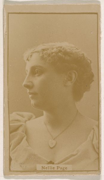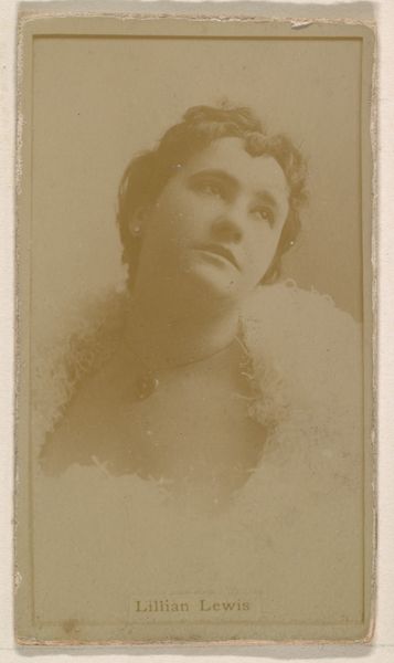 Editor: So, here we have "Marie Reid, from the Actresses series," created around 1890 by the Kinney Brothers Tobacco Company. It's a print, but it's based on a photograph. The sepia tone and upward gaze create such a dreamy, wistful feeling. What do you see in it? Curator: You know, it whispers to me of fleeting moments and the pursuit of unattainable dreams, filtered through a lens of early photographic techniques. Back then, promotional cards like this were little windows into the glamorous world of the stage. But beyond the commercial aspect, notice how the artist captures not just Marie Reid’s likeness but also this sort of aspirational aura, right? It's almost as if she's looking toward the possibilities, the what-ifs. Don't you think there's a lovely, melancholy tenderness about it? Editor: Absolutely. It's like a paused breath, right before she steps onto the stage. The slight blurring of the image only heightens that sense of fragility and bygone beauty. The line of her throat is striking, the curve seems to invite contemplation. Did she choose to gaze upwards like that? Curator: Perhaps. Or perhaps the photographer knew exactly the pose to elicit. What strikes me, truly, is the pre-Photoshop world it depicts. It’s about suggesting rather than dictating. Now, what about her presentation speaks to you about her time? Editor: Well, her hairstyle for one, with those soft curls, but it's more about the overall delicacy and subtle color palette. It feels very romantic and ethereal, maybe even a bit staged? Curator: Staged, certainly. It's selling you more than just an actress, isn't it? The tobacco becomes synonymous with glamour. I think these kinds of pieces really do give us such delicious breadcrumbs of the past. What I'll remember most from this is not only this photograph but what the photograph suggests. Editor: Definitely! It’s incredible how much context and emotion can be conveyed through such a small, simple image. I am always stunned that Tobacco companies would produce what is effectively portraiture!