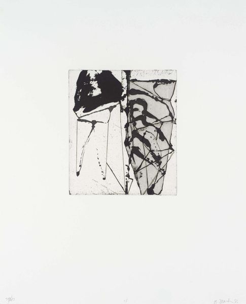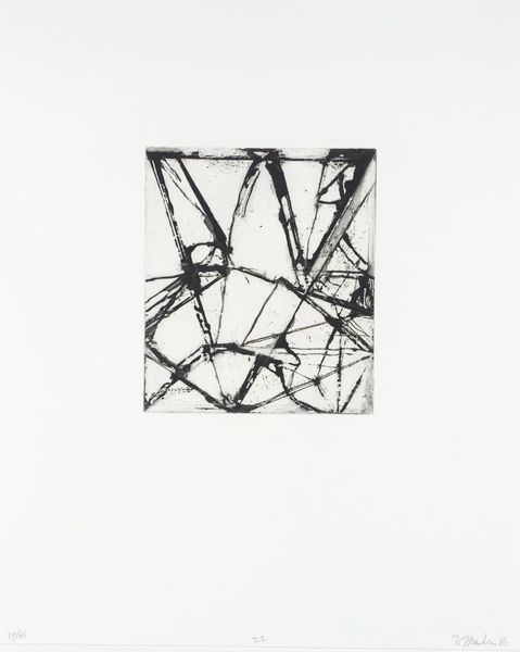Curator: Here we have "11" by Brice Marden. It's an etching, about 20 x 17 centimeters. Stark. Editor: It feels like a memory trying to surface...or a half-remembered dance. Curator: Marden often explored the physicality of the printing process. Think about the pressure required to transfer those inky lines. Editor: Yes, the immediacy is compelling. Almost as if the artist were chasing a fleeting thought. I'm reminded of Cy Twombly's mark-making. Curator: Absolutely. It really challenges the hierarchy between drawing and printmaking, doesn’t it? Editor: True. It's a wonderfully concise piece, inviting you to complete its narrative. Curator: The stark materials really enhance that quality. Editor: It leaves me with a sense of incompleteness, yet oddly resolved.