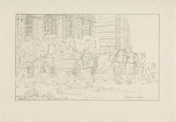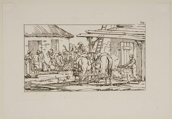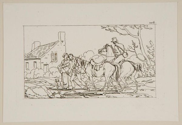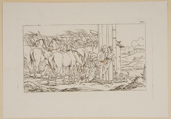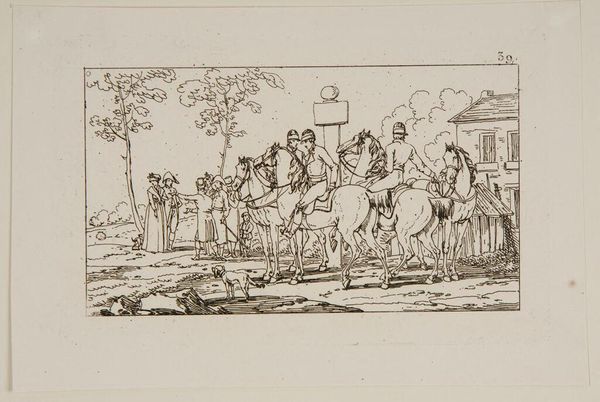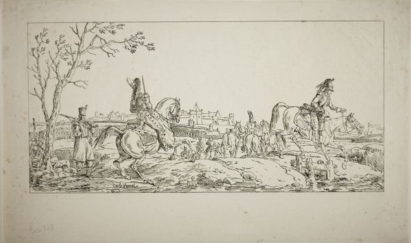 Curator: This delicate line etching, entitled "Plate XXIX," is by Jacques-Francois-Joseph Swebach, and it resides here at the Harvard Art Museums. Editor: It has a wonderfully tranquil feel, the way the horses are drinking from the stream. The composition leads your eye gently from left to right. Curator: Precisely. The subject—a group of riders seemingly crossing a shallow river—suggests themes of travel and movement, but also the logistics and labour required. Editor: There's a tension though, isn't there, between the smooth lines of the horses and the rough textures of the architectural ruin in the background? It introduces a formal unease. Curator: Perhaps Swebach is commenting on the transience of power, contrasting human activity with the endurance of structures built through forced labour. Editor: Interesting thought. It's a piece that rewards a slow, careful look. Curator: Indeed, and one that connects artistic technique to broader social concerns.