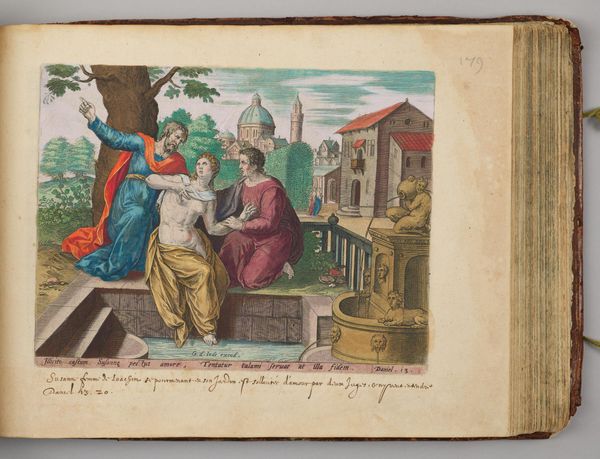 Curator: Hans Collaert the Elder presents us with "Lot and the Two Angels," a work held at the Harvard Art Museums. The dimensions of the sheet are approximately 27 by 36.4 cm. Editor: There’s an immediacy to this scene. The colors, though somewhat faded, convey a sense of urgency and turmoil. The contrast between the angels' ethereal forms and Lot's forceful grip is striking. Curator: Indeed, the material components are crucial to its reading. Collaert was working within a printmaking tradition, navigating the constraints and possibilities inherent in the medium to depict a biblical narrative. Editor: And that narrative is dripping with social implications. Lot, a figure of authority, is seen ushering these figures into what's implied to be a dangerous place, setting up dynamics of protection and the potential for violation. The context of Sodom looms large, a society infamous for its perceived transgressions. Curator: The labor behind the creation of the print, the dissemination of the image to an audience, all speak to the social function of art as a carrier of moral and religious messages. Editor: Yes, a moral message that, viewed through a contemporary lens, needs serious unpacking. The "sins" of Sodom have been historically weaponized against marginalized groups, and this image, intended to promote righteousness, now provokes critical questions about power and prejudice. Curator: Precisely. Examining these older works through contemporary interpretations can encourage meaningful discussion about enduring social issues and complexities. Editor: It definitely complicates a straightforward interpretation, prompting a necessary dialogue.