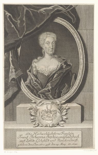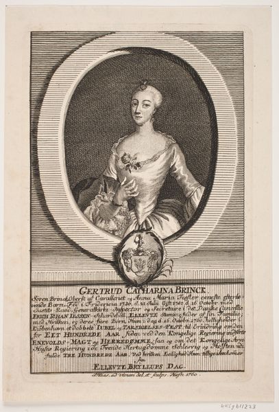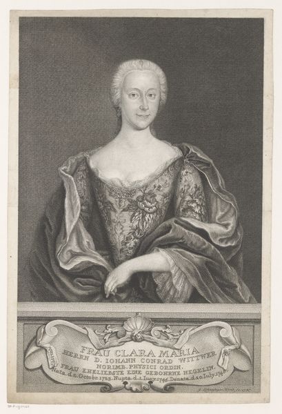 This print, made by Johann David Schleuen, depicts Maria Sabina Darnmann, and was created using etching and engraving techniques. These processes involve painstakingly incising lines into a metal plate, applying ink, and then pressing the plate onto paper. The image’s crisp lines and tonal variations are a testament to Schleuen's skill and labor. Note the detailed rendering of Darnmann’s dress, the textures and patterns suggesting luxurious fabric that speaks to her status and wealth. This wasn't just about representing her likeness; it was about displaying social standing through material culture. Prints like this one played a crucial role in disseminating images and ideas across society. They were relatively affordable compared to paintings, making portraiture accessible to a wider audience. The very act of reproducing an image multiple times raises questions about how art and status were being made more democratic, though still within the confines of a class-based society.