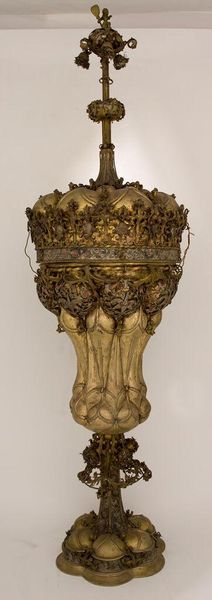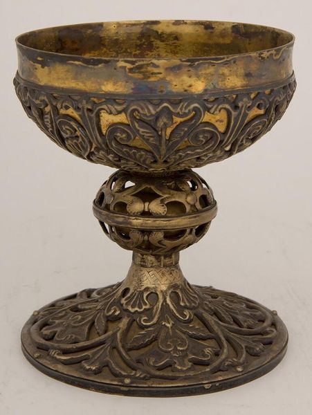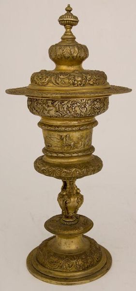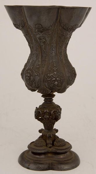 Curator: This object is a sixteenth-century facsimile of a goblet featuring Jonas, likely crafted in Lower Germany. Editor: I'm struck by its somber, almost melancholic presence. The patina suggests a history of both reverence and neglect. Curator: Observe how the anonymous maker uses repetition of form to create a balanced, if not slightly austere, structure. The goblet's shape mirrors itself. Editor: And the figure of Jonas—a symbol of rebirth and divine intervention. The cup echoes the story of Jonah and the whale, a testament to resilience. Curator: Notice the careful symmetry and how the textures, even in this facsimile, play with light and shadow, complicating its surface. It's a study in contrasts. Editor: This object feels heavy with meaning. A reminder that even in darkness, hope and redemption are always possible. Curator: Yes, and formally, it is an intriguing manipulation of material and proportion, wouldn't you agree? Editor: Indeed, a potent symbolic vessel and a fascinating study.