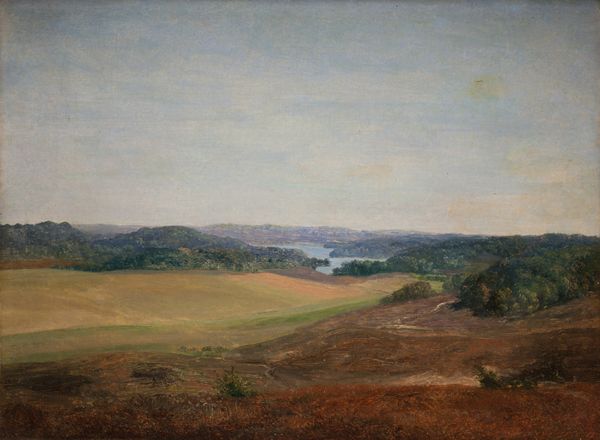 Alexandre Desgoffe created this small oil on canvas titled "Landscape near Chiusi, Tuscany". The painting draws us in with its warm earth tones and expansive vista. Note how the composition is structured by horizontal bands: the foreground with scattered rocks, a middle ground with trees and fields, and distant hills under a pale sky. This layering creates depth, yet the relatively muted palette unifies the scene, softening the transitions between planes. Desgoffe’s technique, especially his handling of light and texture, invites reflection. Look at how the sunlight glances off the rocks in the foreground, creating subtle contrasts that add volume and presence. This method of rendering light wasn't just about capturing visual likeness; it reflected broader artistic and philosophical concerns around perception and representation. The painting invites us to consider not just what we see, but how we see, and how our understanding of space and form shapes our experience of the world.