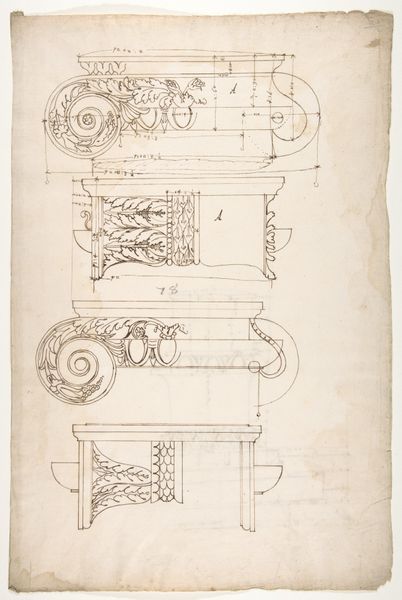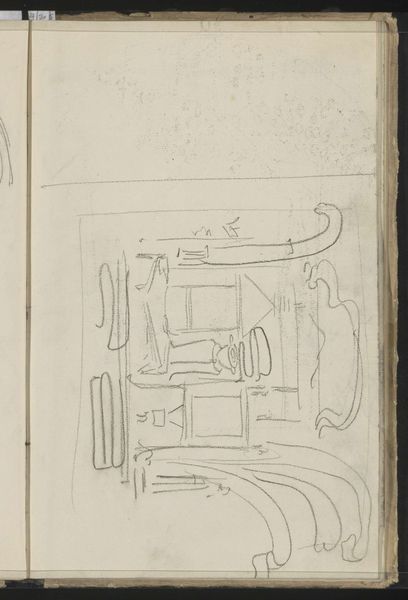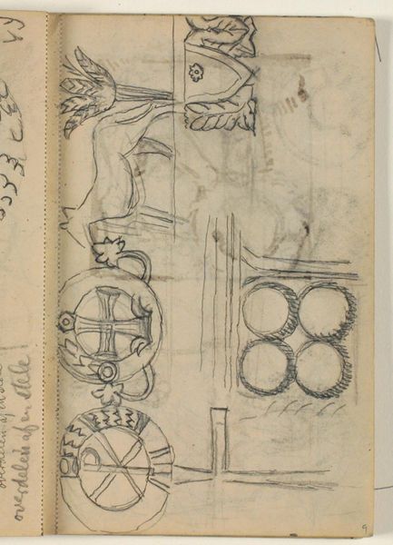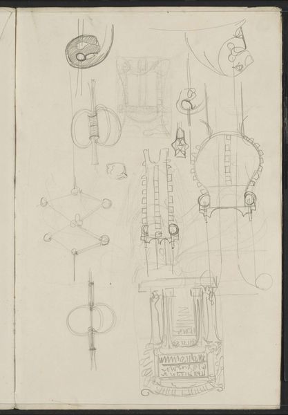 Editor: So, this drawing, "Beslag en slot"—"Mounting and Lock"—by Theo Nieuwenhuis, sometime between 1876 and 1951, caught my eye. It's ink on paper, a simple sketch really, but something about the details, those curlicues… it feels so medieval, like a secret door in a castle. What do you see in it? Curator: Oh, I love this! It feels like stumbling across an architect's daydream, doesn't it? Look at the linework – so confident, capturing not just the shape but the *idea* of these hinges and locks. It's more than just technical drawing; it's like Nieuwenhuis is letting us peek into his design process. Makes you wonder what grand door this hardware was destined for, doesn't it? What sort of treasure it might have secured. Editor: It does have that "treasure room" vibe. So you're saying it's more about the design *process* than the object itself? Curator: Precisely! Think of the sketchbook as a playground for the mind. Nieuwenhuis is toying with form, embellishment, the very essence of security. Perhaps he saw beauty even in the mundane, transforming functional objects into art. Tell me, doesn't the aged paper add another layer, a whisper of history to the image? Editor: Definitely! It gives it a kind of antique quality, makes it feel more like a discovered artifact than a drawing. I almost wish the drawing included more of its original setting so I could place it into a real building. Curator: Me too! Makes you realize the beauty in utility. Editor: I’ll never look at a lock the same way. Curator: Nor will I, and isn't that the magic of art?