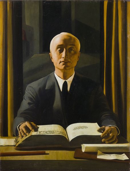 Editor: Here we have Dimitris Mytaras' "Portrait of N.L." from 1975, a painting that strikes me as both regal and a little unsettling. It’s a somewhat ghostly figuration, painted with muted tones... very imposing! What are your initial impressions? Curator: Oh, "unsettling" is a marvelous way to put it. Mytaras, for me, is like a melancholic poet trapped in a painter's studio. This isn't just a portrait; it's a quiet observation about mortality, isn’t it? He seems suspended between worlds... the figure in their regalia appears both present and distant, doesn’t it, like a faded memory struggling to hold form? Does it feel personal or detached to you? Editor: I see what you mean, almost dreamlike. Detached I guess? The background is quite vague. What's with the chest sculpture, do you think? Curator: Ah, the torso... isn't it wonderful? Almost as if it's an emblem of physical strength confronting the ephemerality of being! It's Mytaras's way of whispering, "Look! Here is robust form, soon to vanish, as we all must.” I wonder, do you think the muted color palette adds to this somber quality or diminishes it in any way? Editor: It definitely adds to it. Brighter colors would almost feel disrespectful. I guess Mytaras wants us to contemplate aging. Curator: Exactly! The canvas invites you to lean in, doesn't it? And I appreciate the emotional courage. You know, a reminder to contemplate not just artistry, but life’s delicate dance with oblivion! Editor: That’s powerful, it shifts how I view the entire piece. I hadn't thought of it that way, but that totally reframes it for me. Thanks for the perspective!