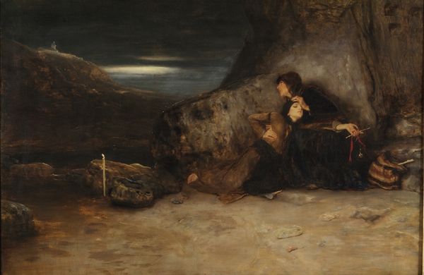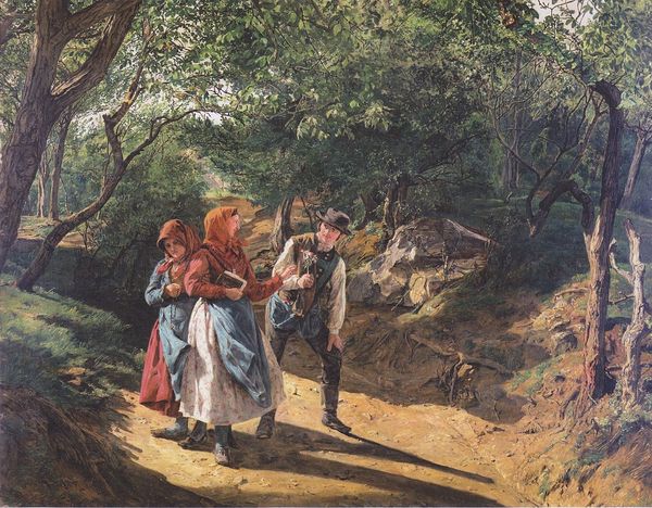 Curator: We are now viewing Vasily Perov’s painting, "Fowler," dating back to 1870. The work presents us with an elderly bird catcher, accompanied by a boy, carefully camouflaged amidst a forest landscape. Editor: My first impression is one of quiet stillness, of hushed anticipation. The earthy tones and dappled sunlight create a scene of remarkable tranquility and... calculation. I wonder what the artist means to communicate? Curator: Notice the rich impasto of the oil paint, especially in the rendering of the trees. Consider, too, the socio-economic realities: Perov, as a key figure of the Russian realist movement, often depicted scenes from everyday life, underscoring the hardships and realities of the peasantry. The means of production – their tools for capturing birds, are laid bare. Editor: Precisely! This pursuit itself speaks volumes. The bird, a recurring symbol of freedom and the soul, is here literally hunted and contained. The open cage lying discarded near the Fowler almost whispers an alternative—a tragic choice for the creature's fate. Curator: I agree, the implication of captivity and consumption cannot be overlooked. Yet it also invites us to examine our own relationship to nature. Bird catching as labor – as a source of livelihood. There's an element of necessity we must confront here, moving beyond sentimentality. Perov meticulously depicts their tools and garments, indicating a lived reality, an engagement with nature not as picturesque backdrop but as resource and livelihood. Editor: Indeed. And observe the visual relationship Perov establishes between the grandfather and grandson. The Fowler peers intensely towards the targeted bird. His grandson beside him looks upwards toward it, as though learning, or absorbing. A lineage. Curator: The legacy of environmental exploitation perhaps? Or the transfer of skills, of a means to survive? It certainly evokes more than simple genre painting – it asks us to reflect on intergenerational impacts, the cycles of production and consumption inherent in society. Editor: This prompts profound ethical questions doesn't it? It's an image teeming with cultural symbolism, speaking of nature’s bounty versus our rapacious nature. I’ll certainly leave contemplating that tense juxtaposition. Curator: Absolutely. A fitting close; thank you. By understanding the painting’s materiality and the processes behind its creation, we get a stark picture of how art represents our world and, importantly, invites us to engage with it thoughtfully.