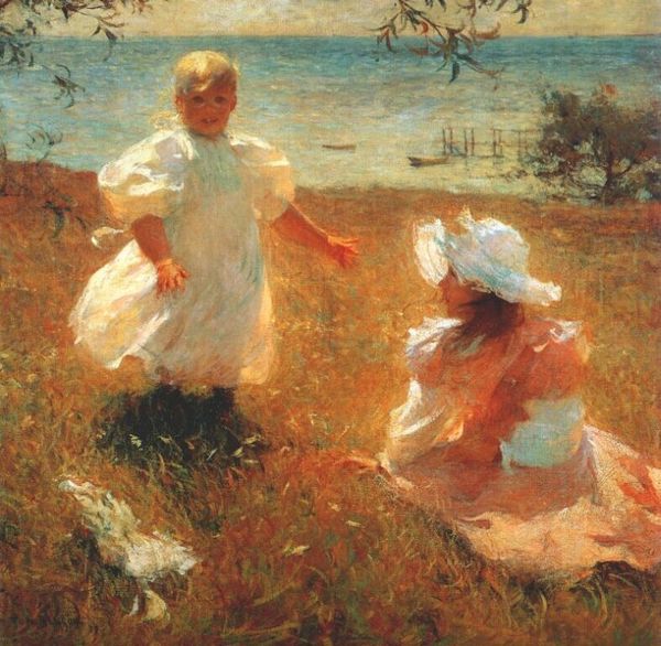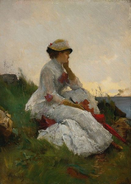 Curator: Well, here's a painting radiating the freshness of a summer afternoon: Edward Henry Potthast's "Walking in the Hills". Editor: It's undeniably charming. My first impression is of fleeting happiness. There's something so carefree about the scene, the light, the figures... almost as though you are watching a happy memory. Curator: Potthast was very taken with the plein air style, a method where artists paint outdoors, capturing the immediate impression of light and color, and "Walking in the Hills" feels totally like that: spontaneous. The quick, broken brushstrokes really give you a sense of movement. I get that joyful feeling too! Editor: Absolutely. The attire they are wearing makes me consider the symbolism around white clothing. It's suggesting purity, innocence, perhaps even a sense of optimistic anticipation. Yet, at the same time, white has often been associated with mourning; the transience of time perhaps? I see it and wonder about who is now looking at those people, their history known to only a few. Curator: That's a fantastic insight, actually. I get this very American sense of optimistic possibility here, perhaps that sense of escaping to the seaside or open country. It's certainly evocative... Almost like watching a scene from a dream. And a bunch of those impressionists did take it a step further. Did they always get that balance? Sometimes they are trying too hard. Editor: And that kind of balance, well it's interesting you pick up on that, I'd agree. Do the people who find their place in society get their sense of belonging right either? How much is confidence? Or indeed a facade? It reminds me that, sometimes, happiness might also just be about pretending a little bit. A bit of naive acceptance can do us good at times... perhaps Potthast wanted to catch a scene like that, and for us to catch something from the ladies and be reminded. Curator: Yes, I'm convinced he definitely aimed to stir up that joyful vibe in our bellies as much as the paint and landscape. What can I say, that impression really sticks with me. I find the way the breeze seems to caress the canvas absolutely beautiful, you can almost hear the ladies laughing in the sunlight! Editor: It's been illuminating, exploring these layers beyond the immediate surface joy. This impressionist walk reveals some insightful paths for thought.